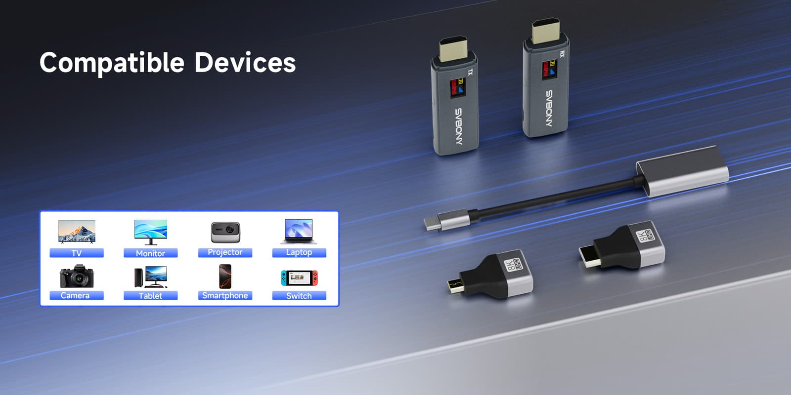 The wireless transmitter can connect to computers, cameras, players, etc., while the receiver can connect to monitors, TVs, projectors, etc.
