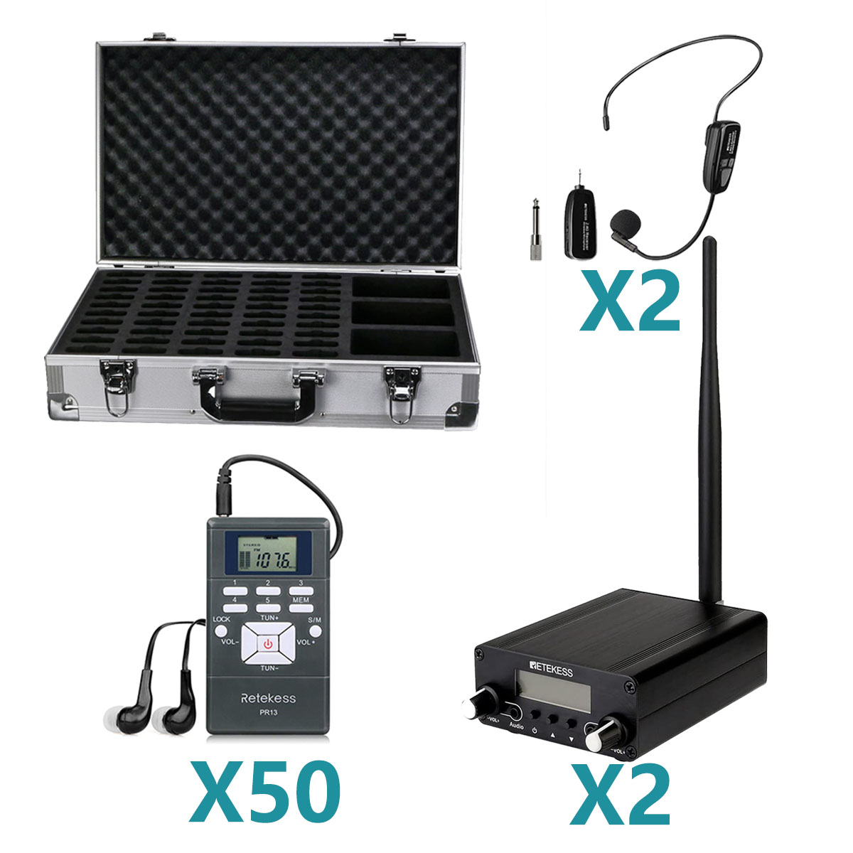One or several transmitters (for the guide/interpreter to use), Multiple receivers (matching the number of listeners), A corresponding number of microphones and earphones/headphones, Charger(s) or a centralized charging case, Necessary connection cables (e.g., microphone cable, audio input cable).