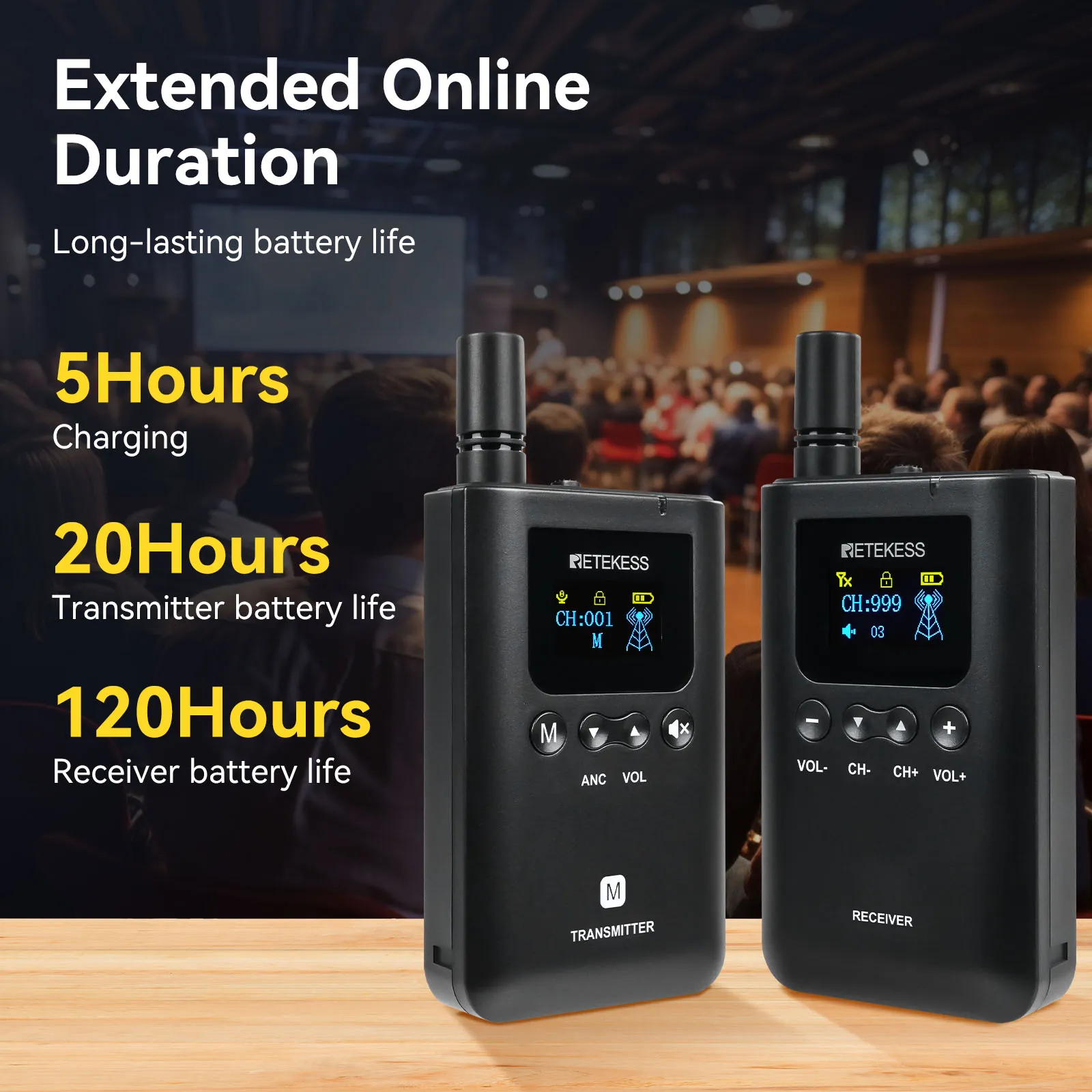 Retekess whisper audio guide system is portable, durable and easy-to-operate audio guide system wireless tour solution. It solves communication problems in long distance and noisy environments. It is suitable for various scenarios such as tour guides, factory tours, museums, schools, translation activities, parties, etc.