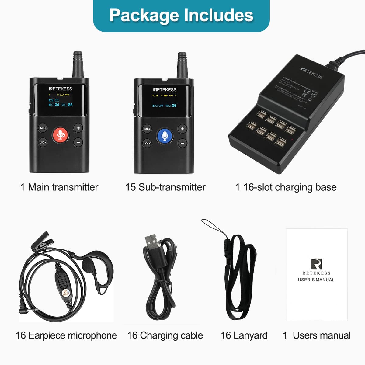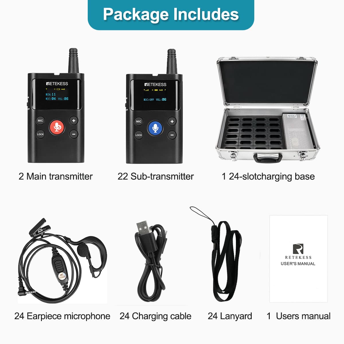 1 x Main Transmitter, 10 x Sub-transmitters, 1 x 16-Slot Charging base,11 x Lanyard, 11 x USB recharging cable, 1 x User’s manual,11 x Earpiece headset with mic |