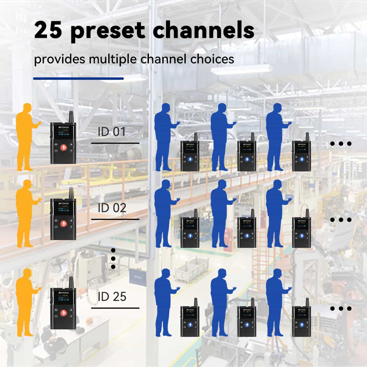 280m (918ft) transmission range suits large industrial 25 selectable channels, Multiple groups can be used simultaneously in the same area without frequency crosstalk.