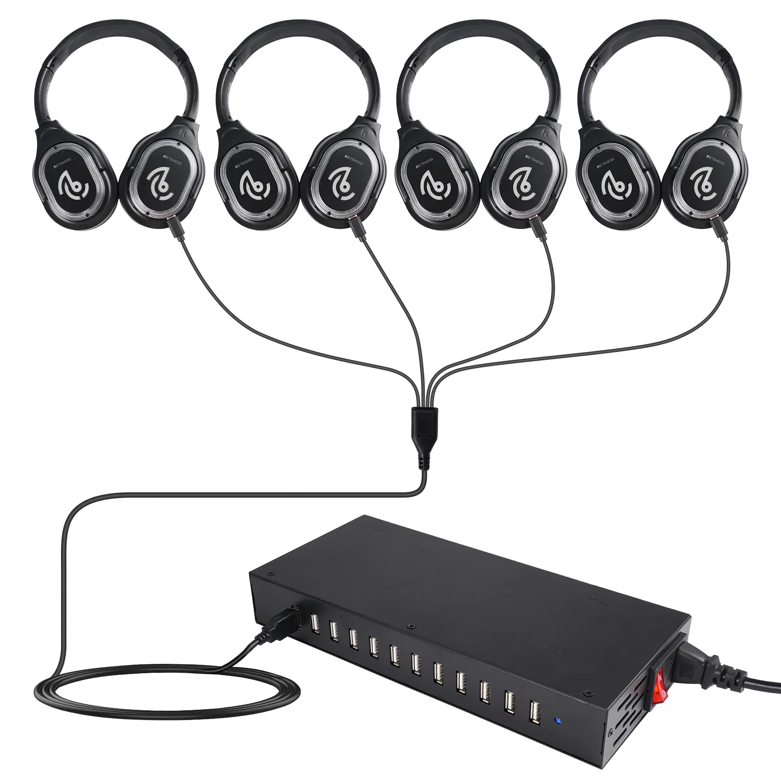 Keep your silent disco headphones ready for back-to-back events. This 12-port USB charging dock is specifically designed for Retekess TA004 TA004S headphones, as well as other compatible USB-chargeable headsets.