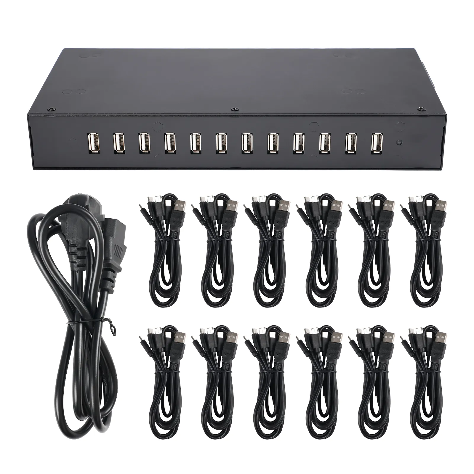 The dock features 12 independent USB ports, each powered by a 5.5V 36A switching power supply. When paired with 1-to-4 charging splitter cables, a single port can charge up to 4 headphones at once — allowing you to charge up to 48 headphones simultaneously from one compact dock.