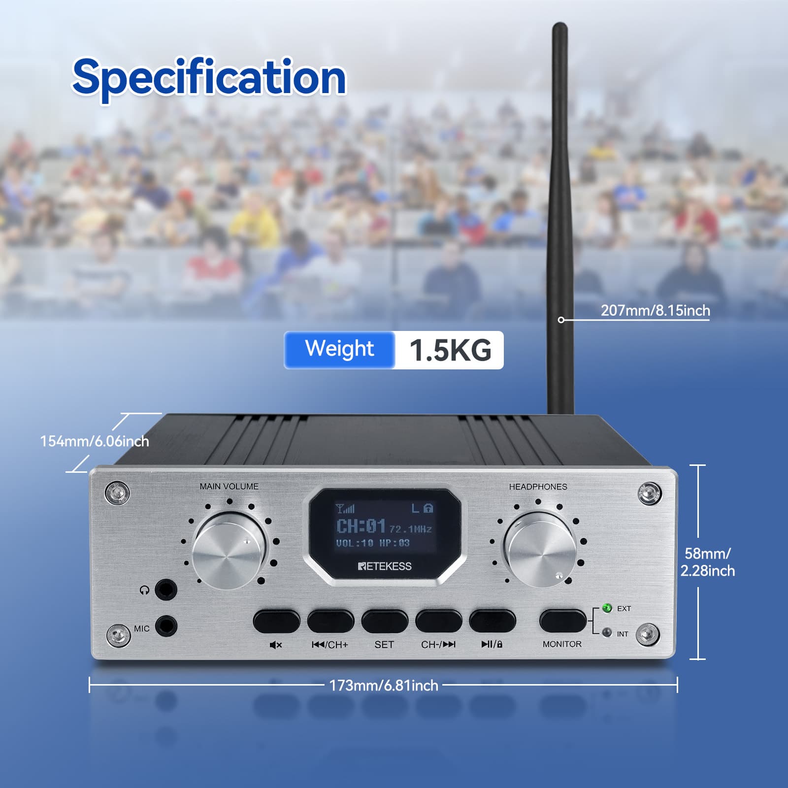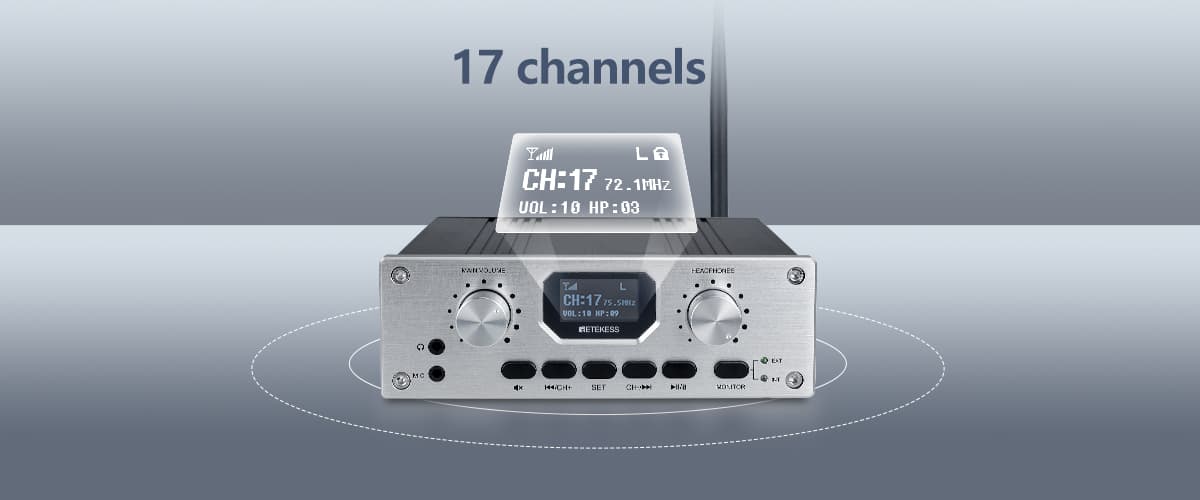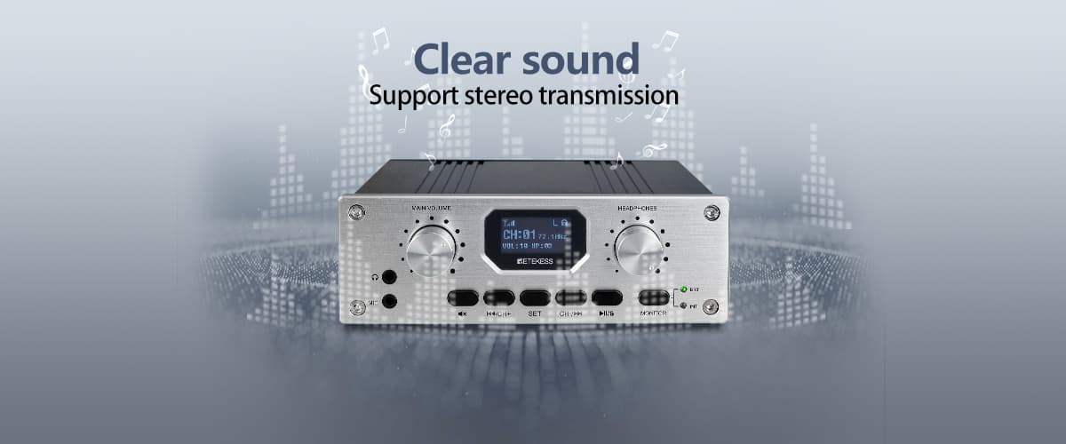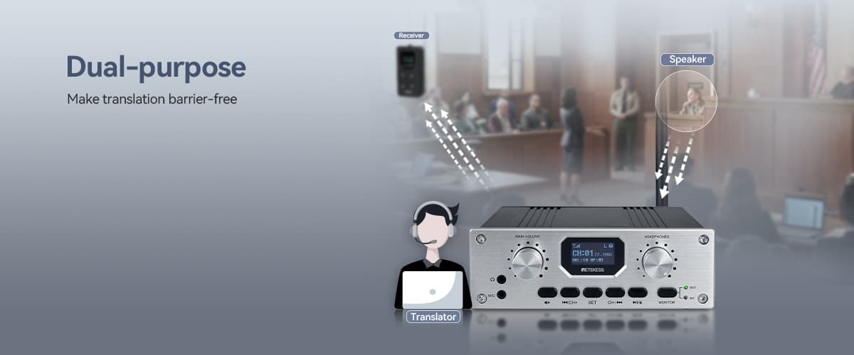 Stop worrying about carrying multiple devices!The Retekess TT119 is an all-in-one desktop FM receiver transmitter integrates receiving and transmitting functions.Simply use the transmitter itself to listen to the speaker's original audio source—no extra receiver required.Small size and portable, the device saves space and is easy to carry,whether in a conference room or on the podium;Featuring a high-contrast LED display and intuitive menu, it’s incredibly easy to set up and operate. Enjoy true plug-and-play convenience.