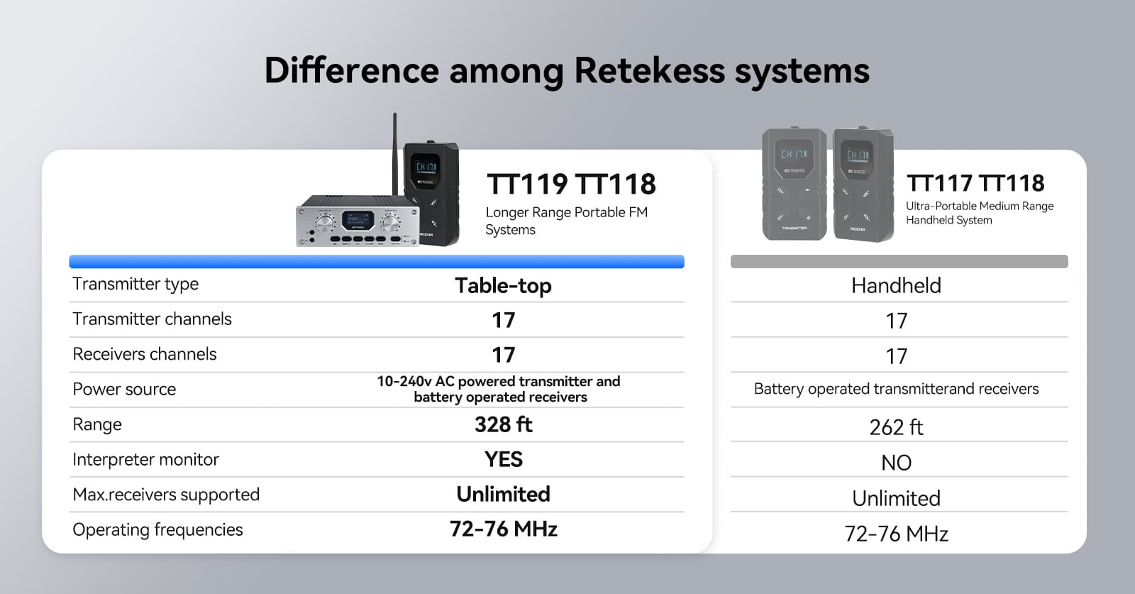 Difference among Retekess systems:| TT117 TT118 Ultra-Portable Medium Range Handheld System |