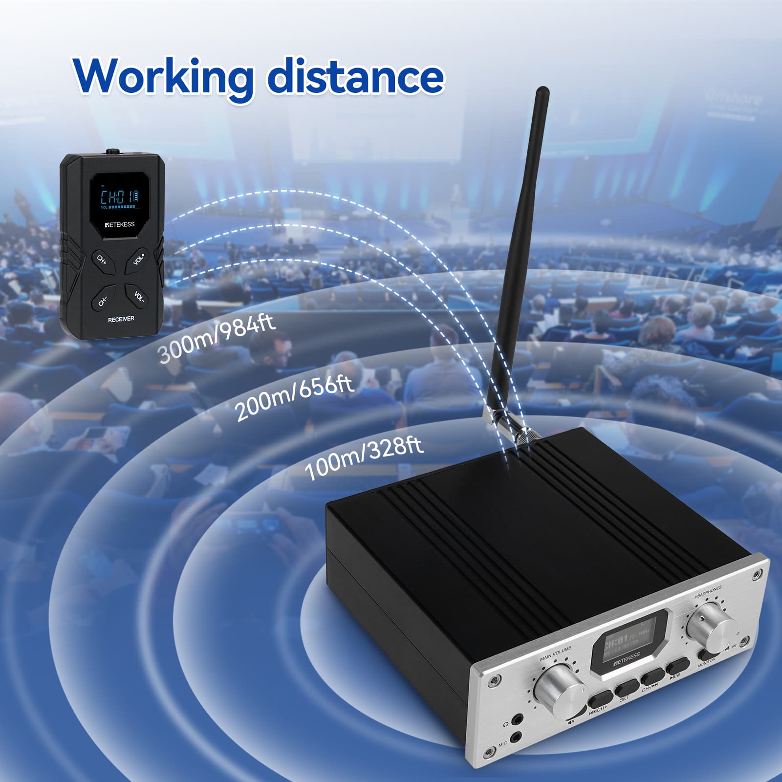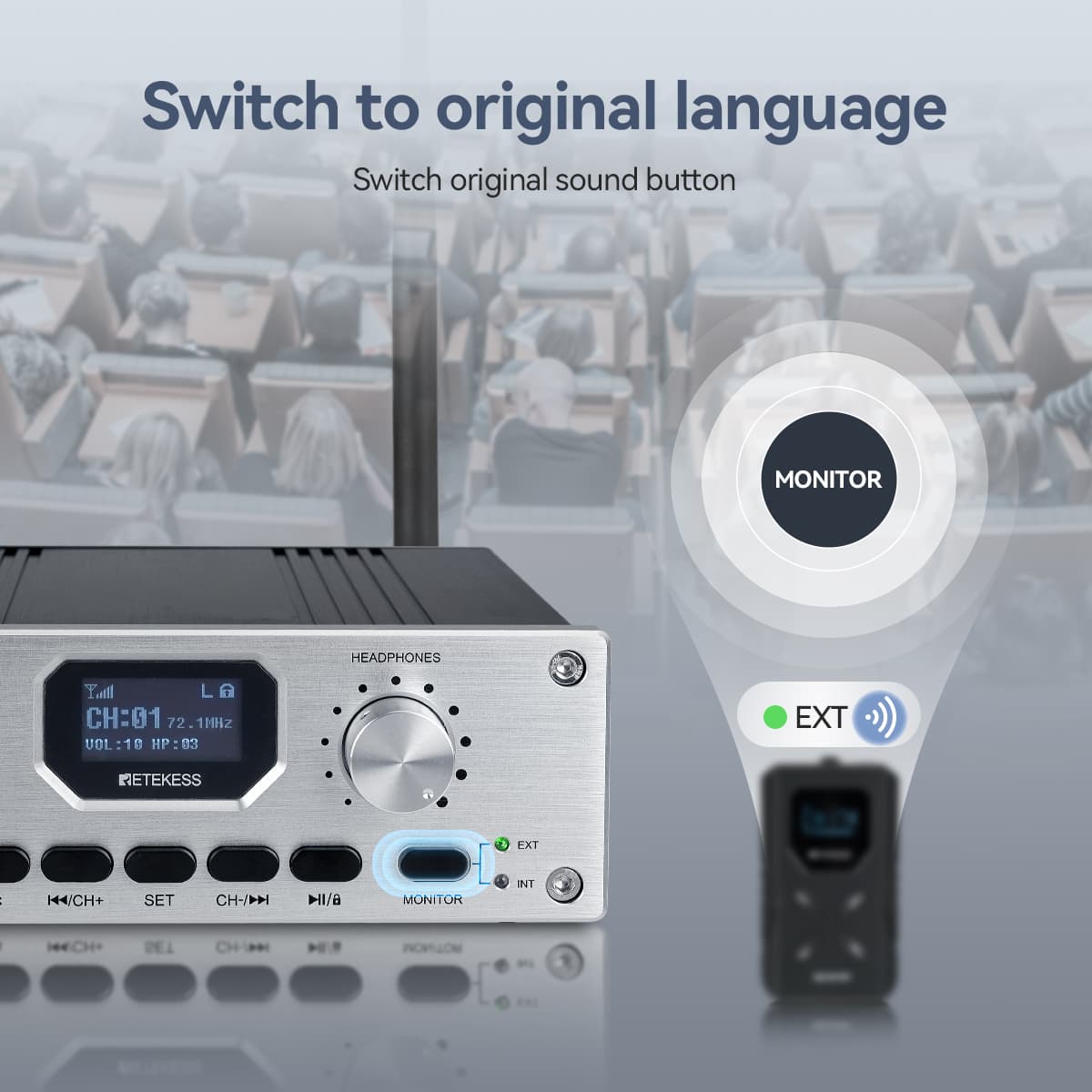 Retekess TT118 receivers are ideally used alongside TT119 FM transmitters.In any conference or event with hundreds of receivers, there is no time to deal with interferences that may require several hours to reprogram each of the devices. There is nothing like the simplicity of the Retekess TT118 receiver! Simply tune both the receiver and transmitter to the same channel to start listening—an intuitive process suitable for both new and experienced users.