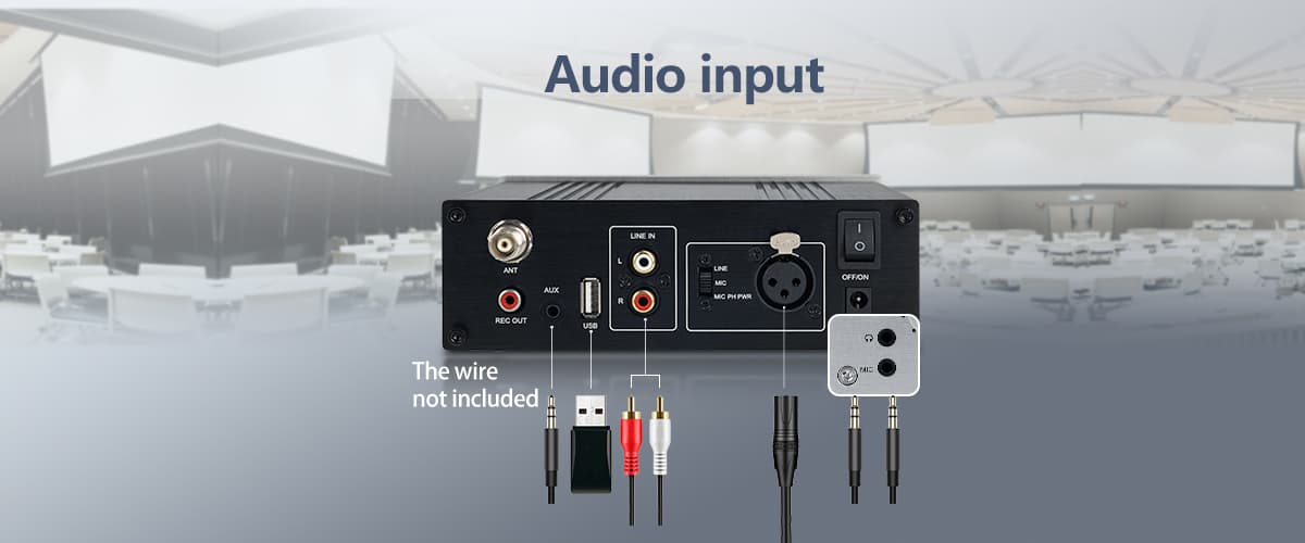 Professional audio inputs,The TT119 transmitter supports XLR/AUX/USB/RCA audio interfaces.The interpreter simply connects a microphone with a 3.5mm plug into the unit to broadcast their voice. Unit also can connect to a sound system through a line-level (RCA) jack to broadcast music or other audio service. USB storage can output the recording content.Listeners can tune in using any compatible FM receiver set to the 72–76 MHz band.