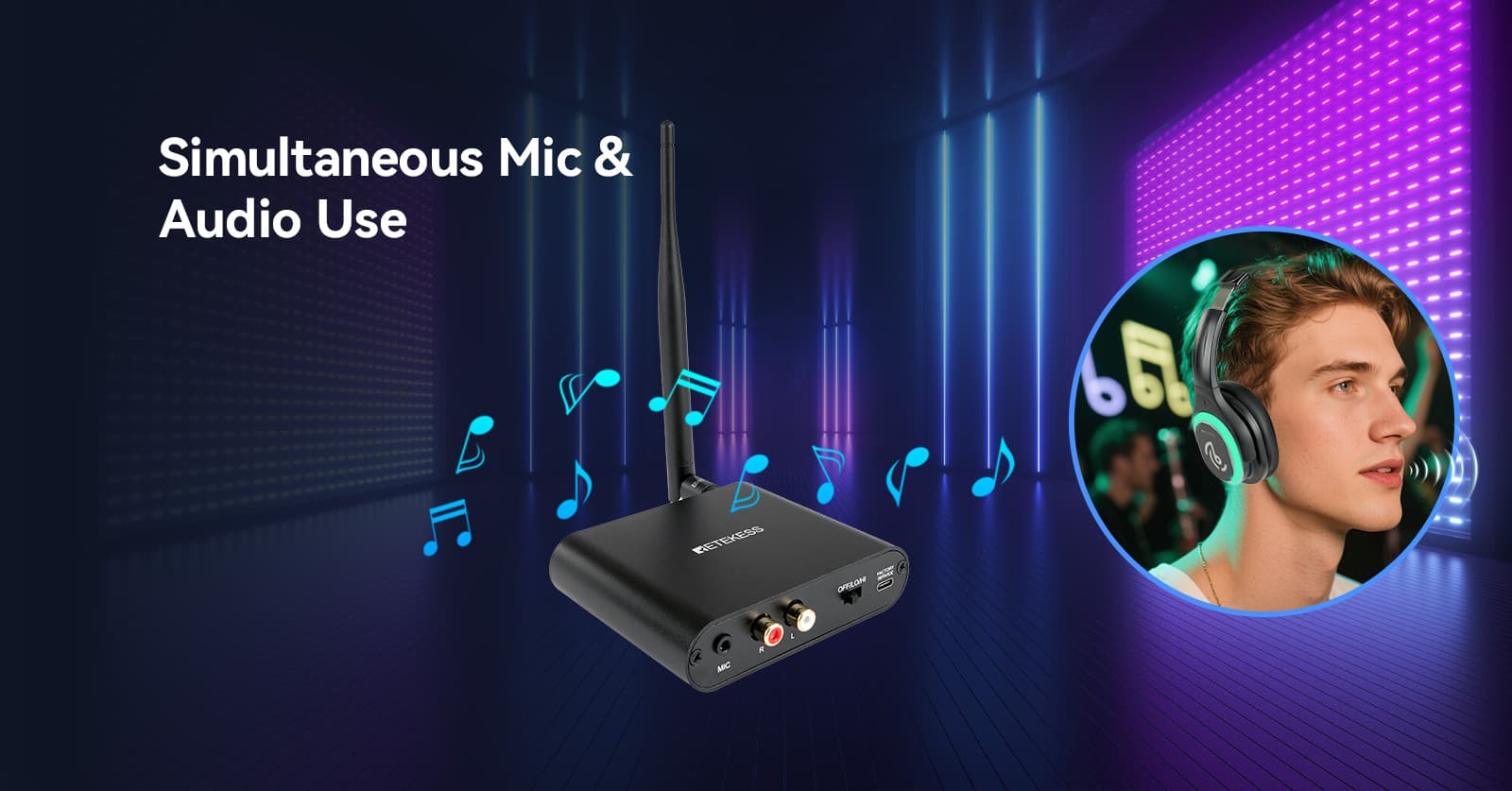 Seamlessly integrate with your existing setup. The TA003 transmitter supports stereo transmission via 3.5mm AUX and features professional RCA audio inputs plus a dedicated microphone input. Connect directly to DJ mixers, media players, cinema systems, cell phones or a mic for announcements with total creative control.