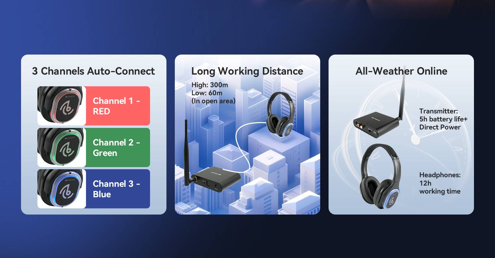 With Retekess 3-channel silent disco headphone system, you can connect to 3 different transmitters all outputting different audio.So, country, rap, and rock lovers can finally party together in one room without a fight for the aux cord!our silent disco system will give you the best sound quality no matter what you choose.By playing up to 3 different audio streams; set DJ’s against each other, play music for all generations and allow your guests to choose which tunes they love the most.