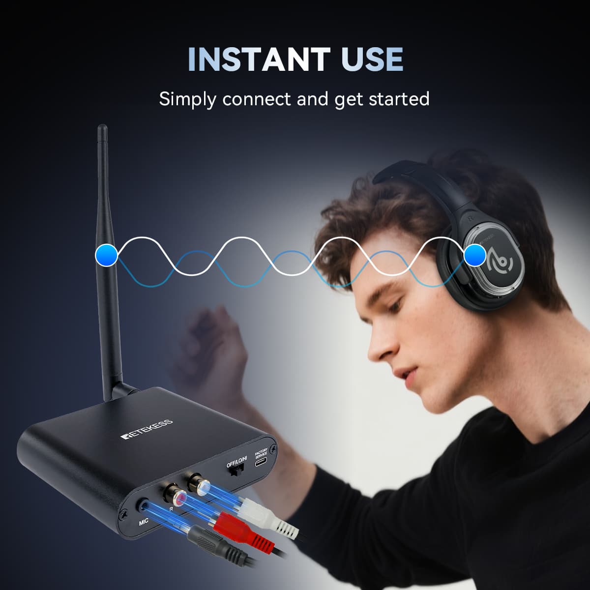 Enjoy true plug-and-play operation with instant automatic pairing. The TA003 Transmitter offers selectable high/low power modes, delivering a stable signal reach of up to 984 ft (300m) in open spaces—so guests can roam the entire venue without dropping a beat. Plus, a single transmitter supports unlimited headphones, making it effortless to scale your party.