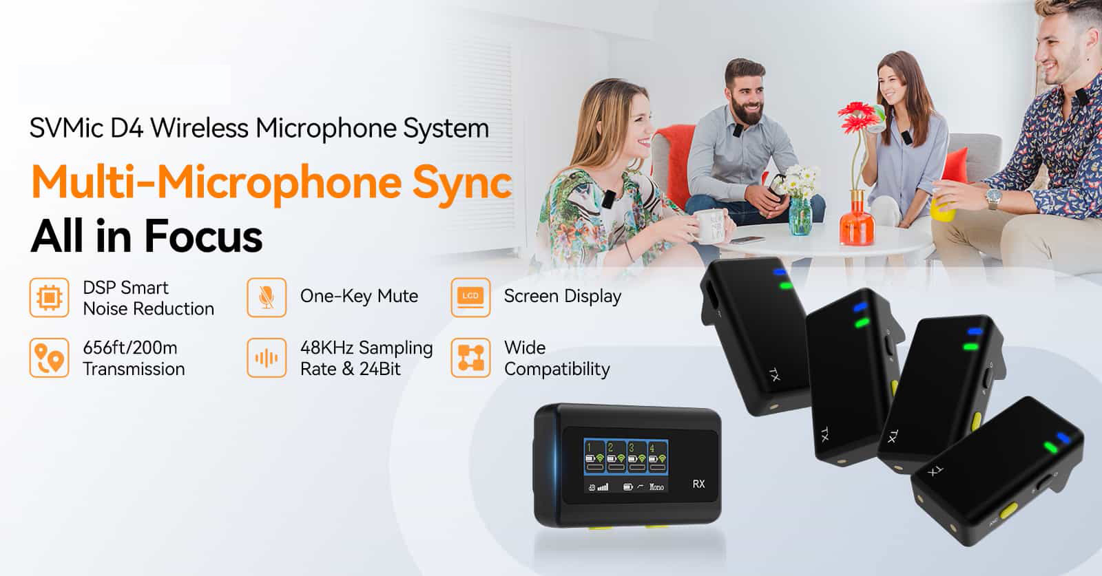 The SVMic D4 lavalier microphone system includes a receiver screen display and transmitter indicator lights for easy viewing of the status of each transmitter and receiver
