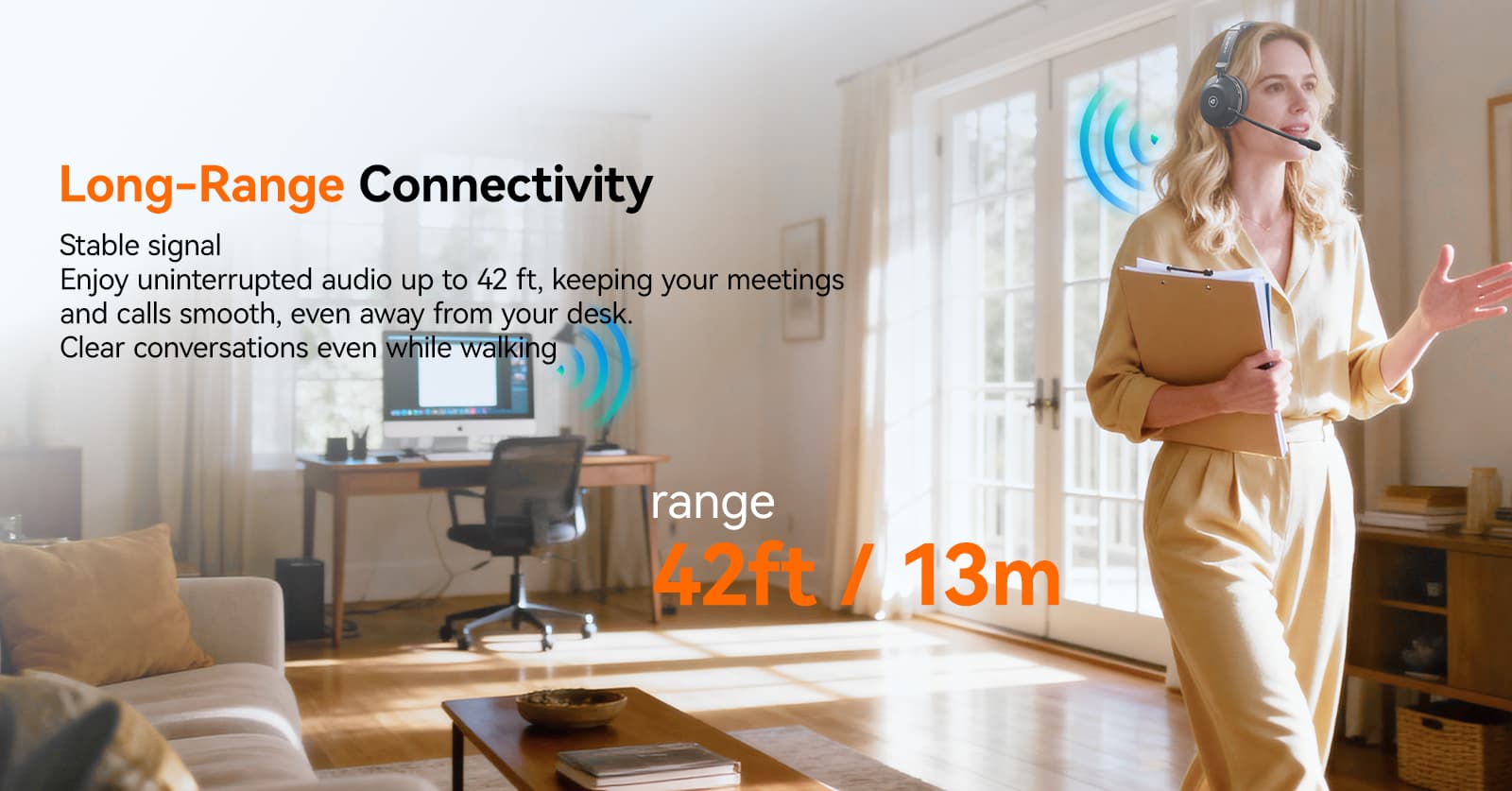 The headset boasts an effective range of up to 42 feet, offering a stable signal and freedom of movement, unrestricted by desktop limitations. Enjoy clear, uninterrupted sound while walking and talking, ensuring smooth calls.