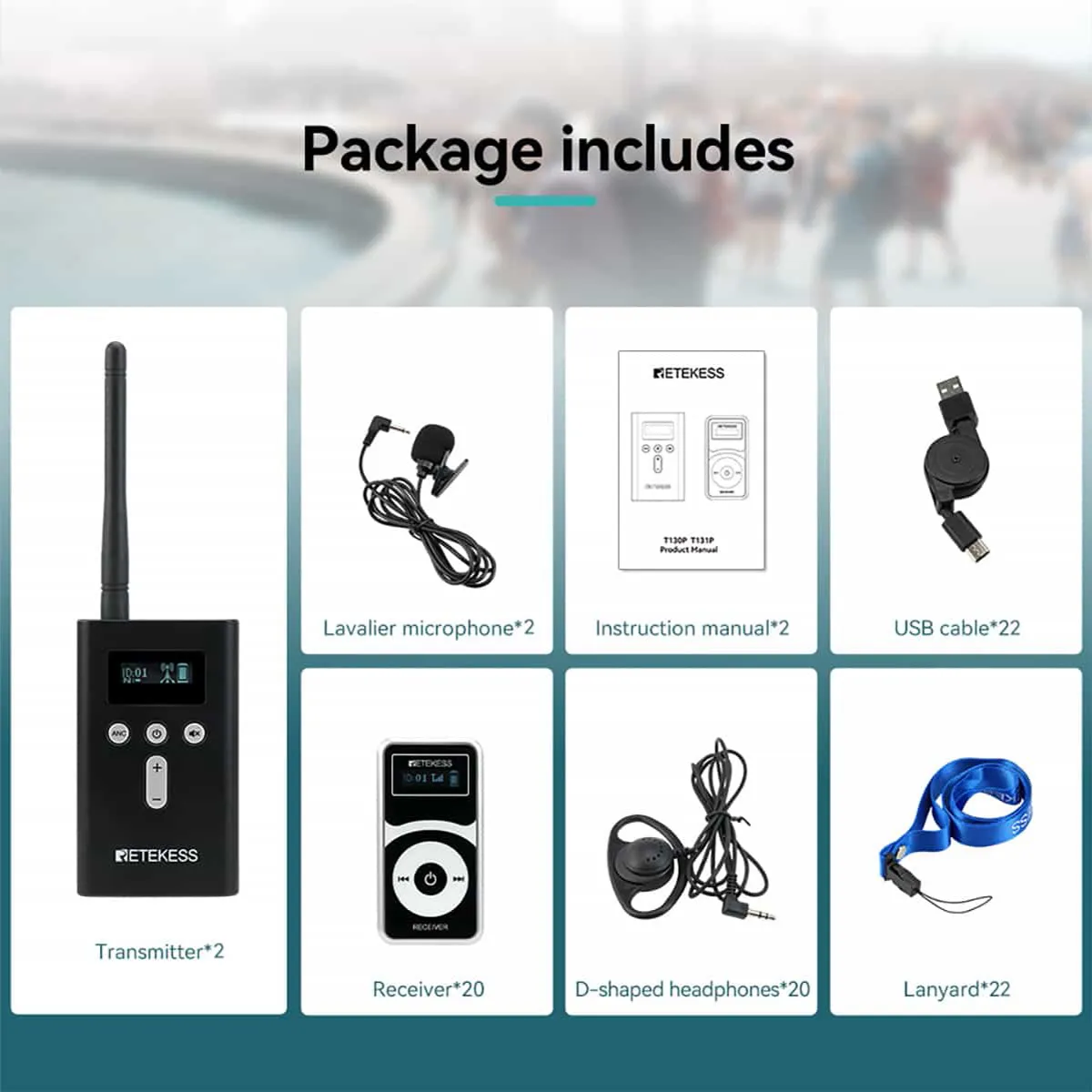 | Transmitter*2、Receiver*20、Lavalier Microphone*2、 D-type Earpiece*20、USB Charging Cable*22、 Lanyard*22、Headset Microphone*1 |
