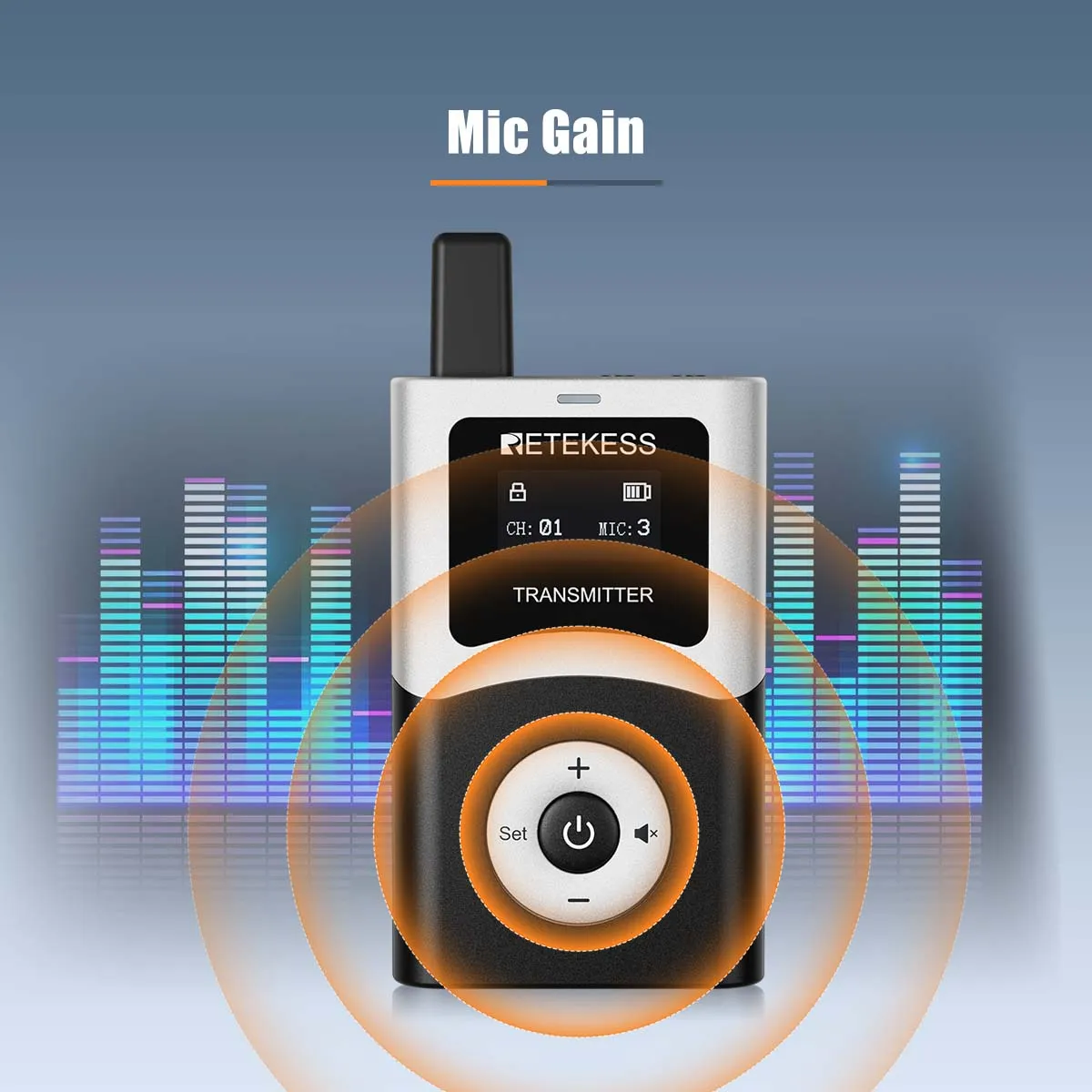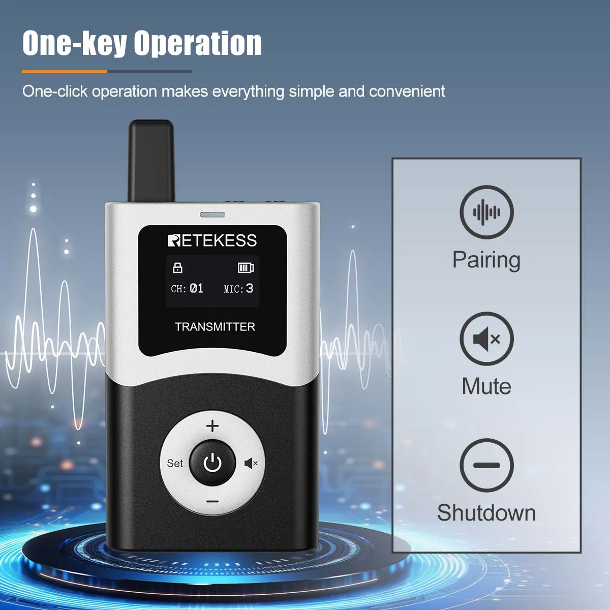 Simply press the mute button on the transmitter to mute the receiver, making it convenient for private conversations.