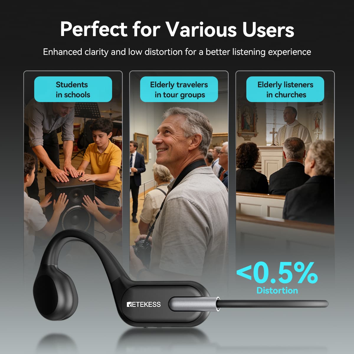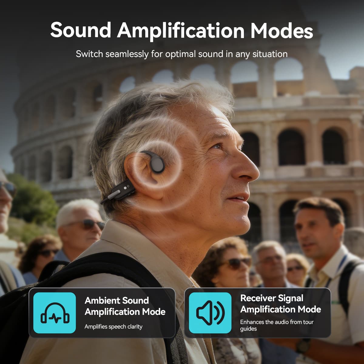 The Bone conduction headphones offer advanced hearing assistance by amplifying sounds for those with hearing difficulties; it ensures clear audio for conversations; making it perfect for both personal and group settings.