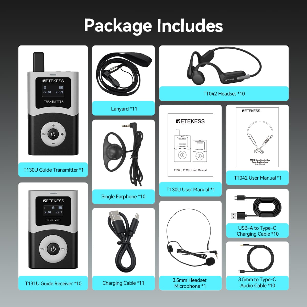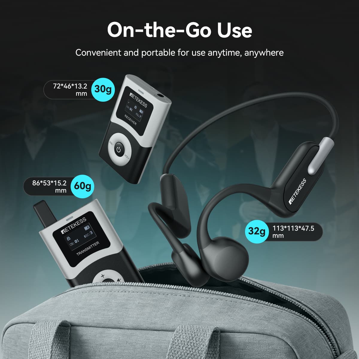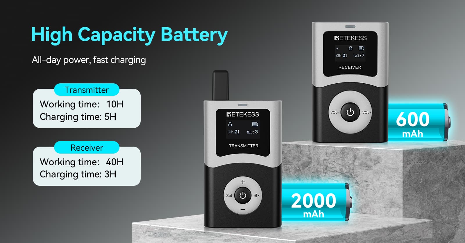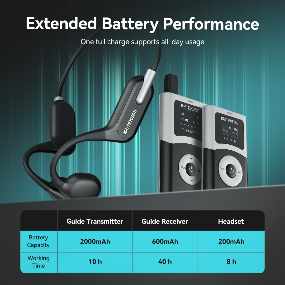 With long-lasting battery performance across all components; the Transmitter; 2000mAh for 10 hours; Bone conduction headphones 200mAh for 8 hours; ensure reliable; all-day use without frequent recharging.