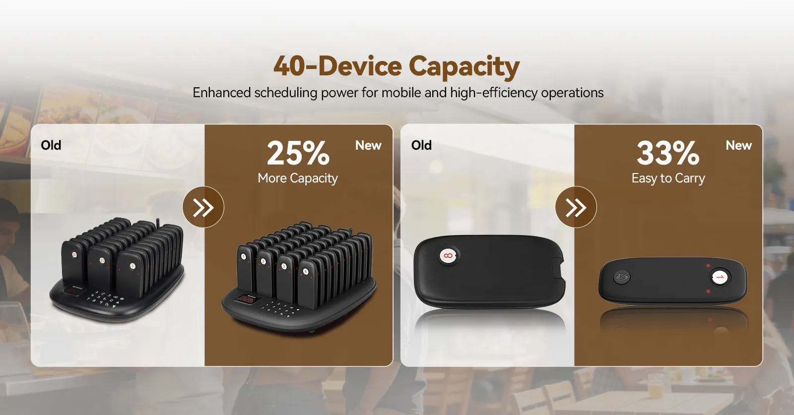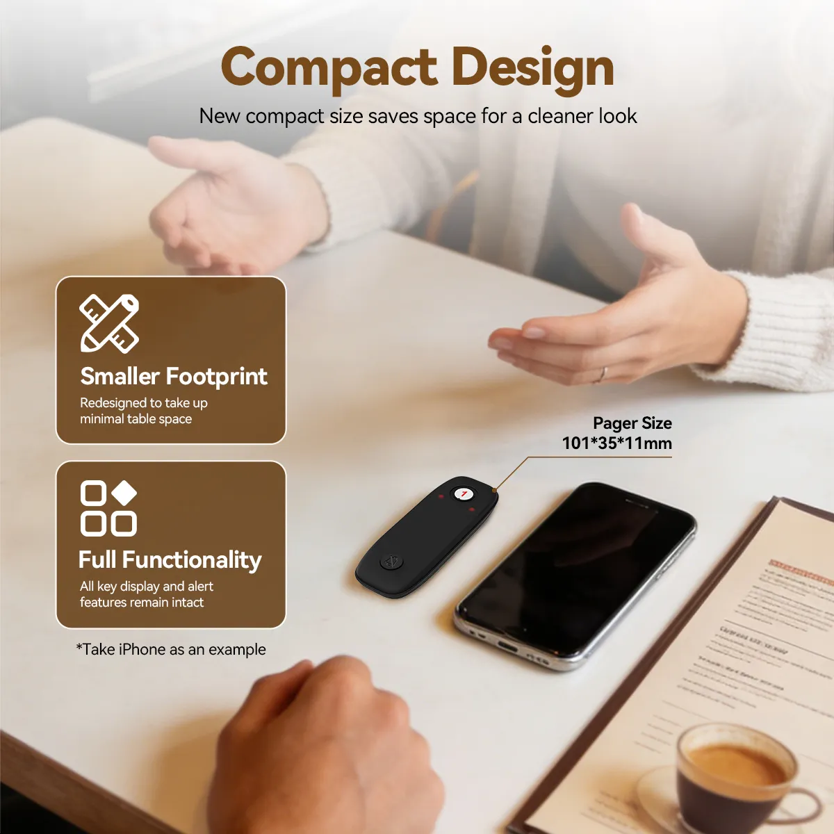 The restaurant pager now features a smaller size; making it more compact and easier to handle; perfect for limited space or quick service; while still offering full functionality.