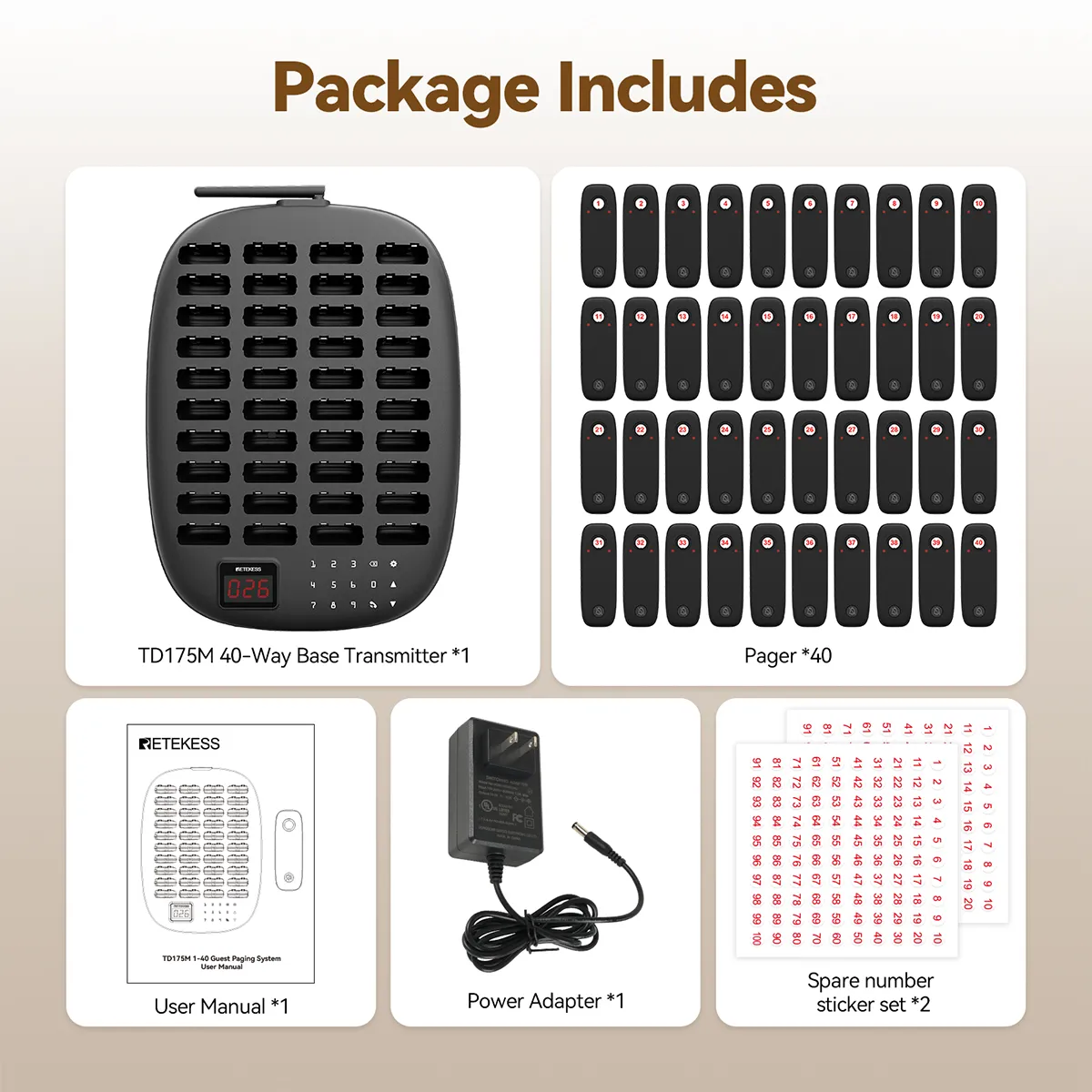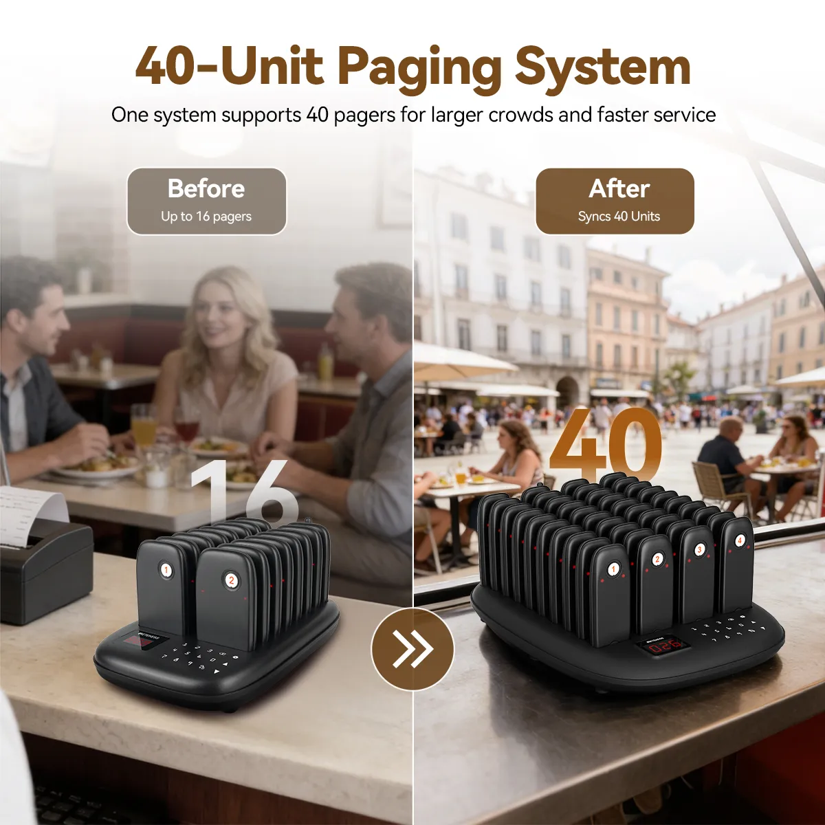The restaurant pager system supports up to 40 pagers; ensuring efficient communication and coordination between staff and customers in large restaurant settings; this allows for timely alerts across multiple locations.