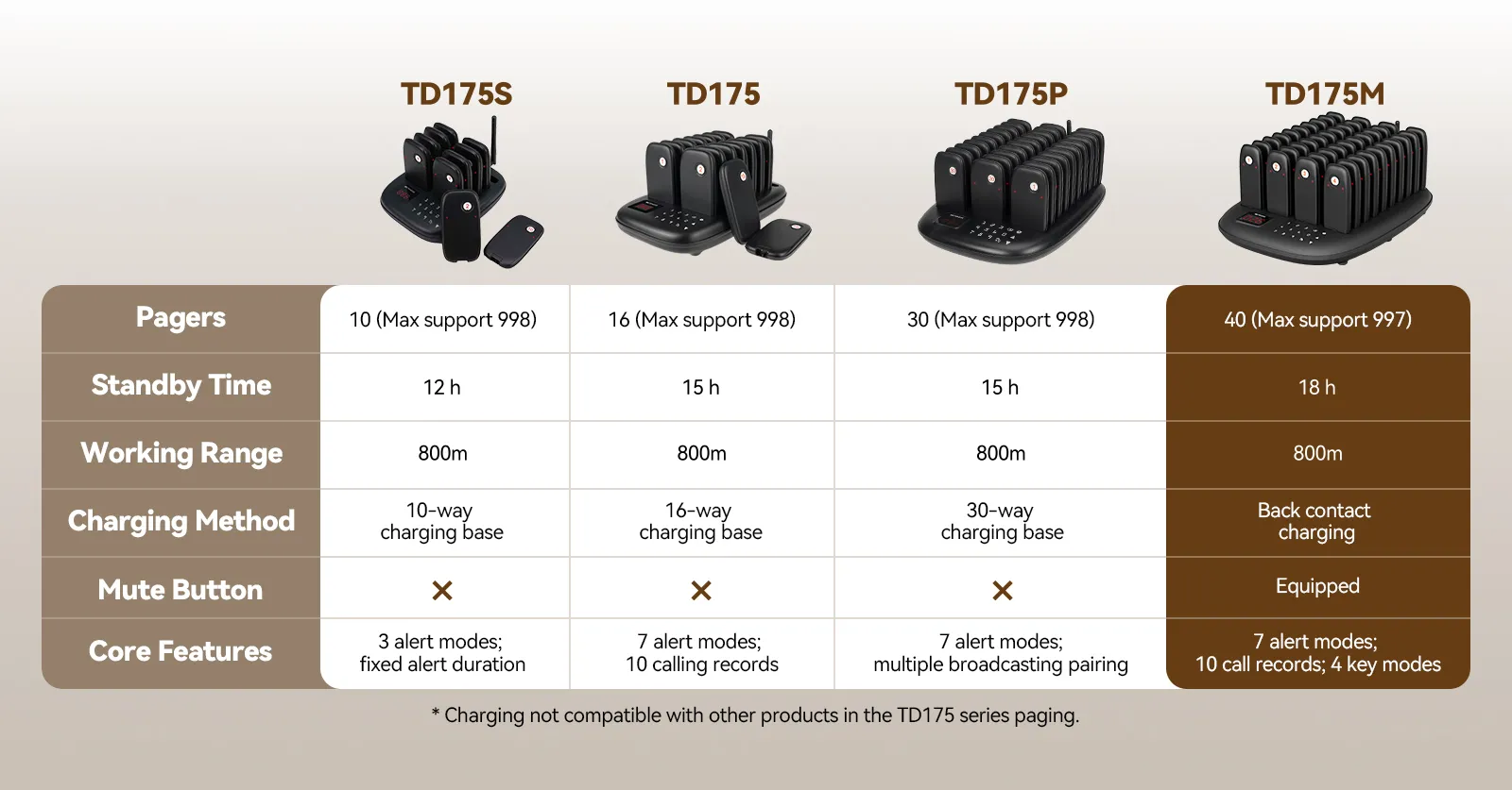 The TD175M restaurant pager system offers a range of features, including auto redial, up to 10 call records, and customizable alert times from 1 to 999 seconds. It ensures efficient communication with 800-meter range, 7 call modes, and one-touch mute. With a smaller menu size and fast charging for longlasting use, it adapts to any environment, offering reliability and convenience for staff and customers.