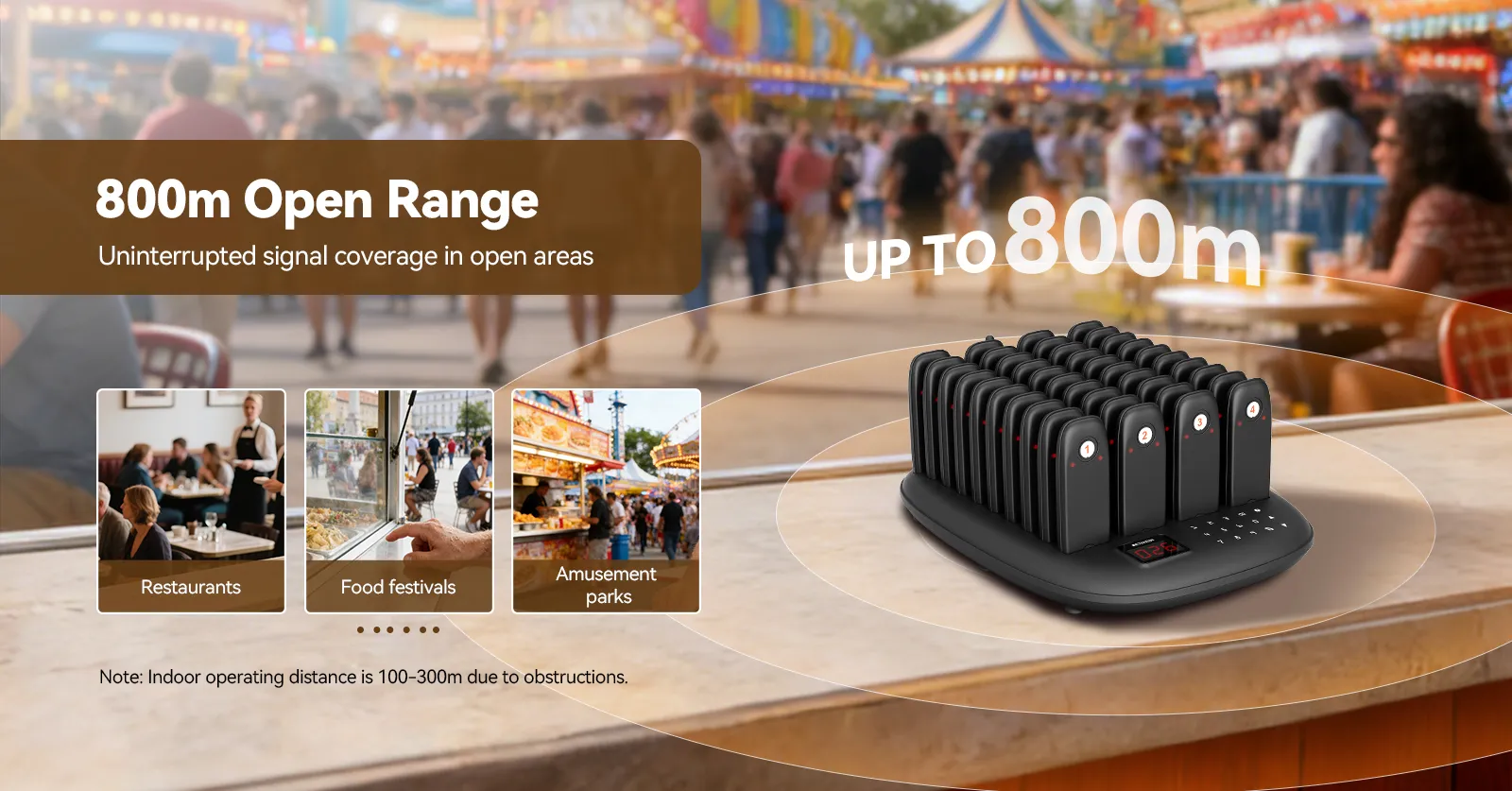With a strong 800-meter calling range in open areas; and 100-300-m range indoors; the restaurant pager ensures reliable communication; allowing staff to notify customers efficiently without interruption