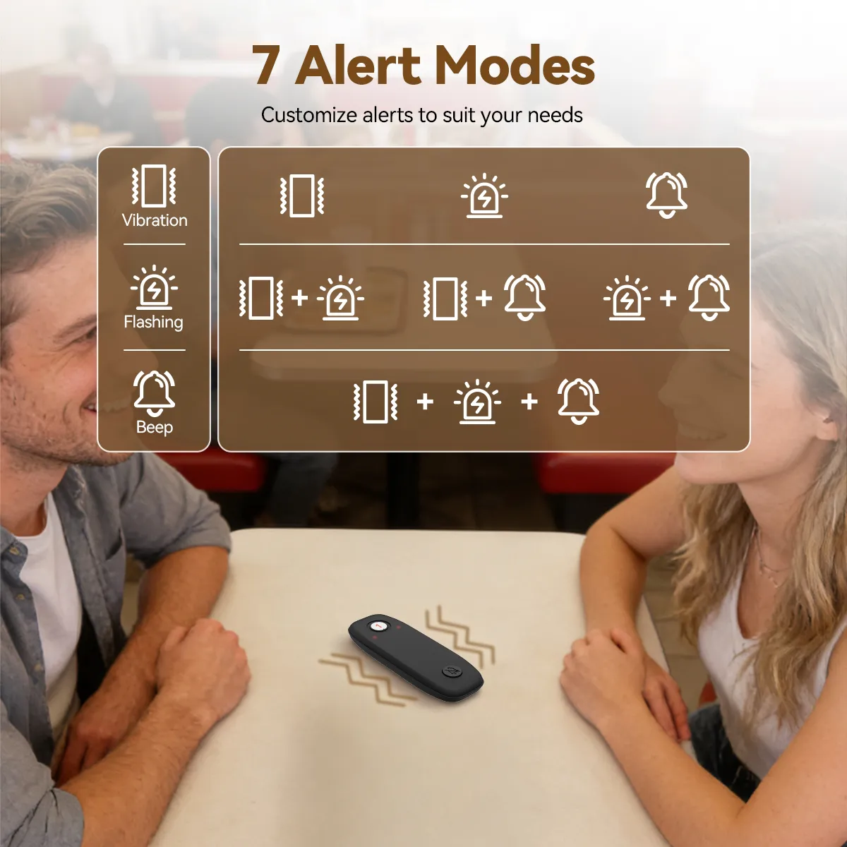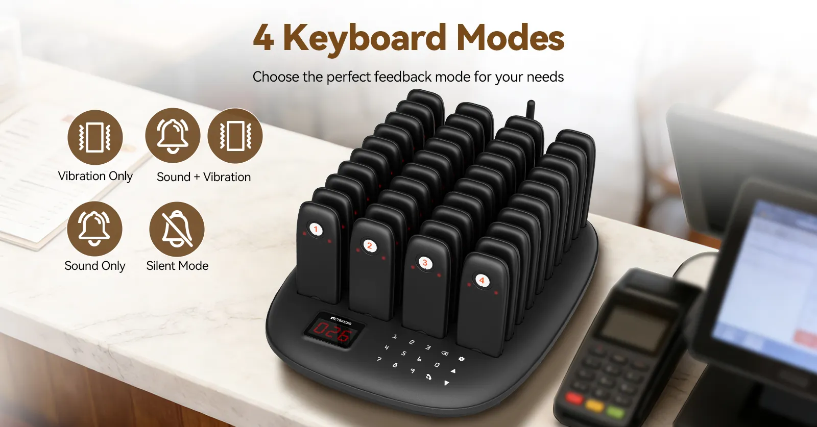 The restaurant pager system offers 7 call modes; allowing to freely combine vibration; beeping; and flashing lights; the vibration mode is especially useful for quiet environments or