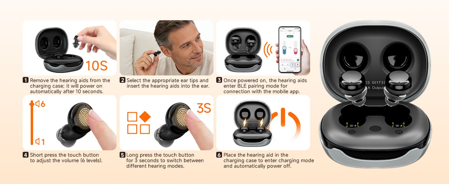 This stylish, over-the-counter hearing aid has a 10-second wait time after power-on, during which you can adjust the wearing angle. We also offer various ear tip sizes to ensure comfortable wear and prevent unpleasant feedback caused by air entering the hearing aid channel.