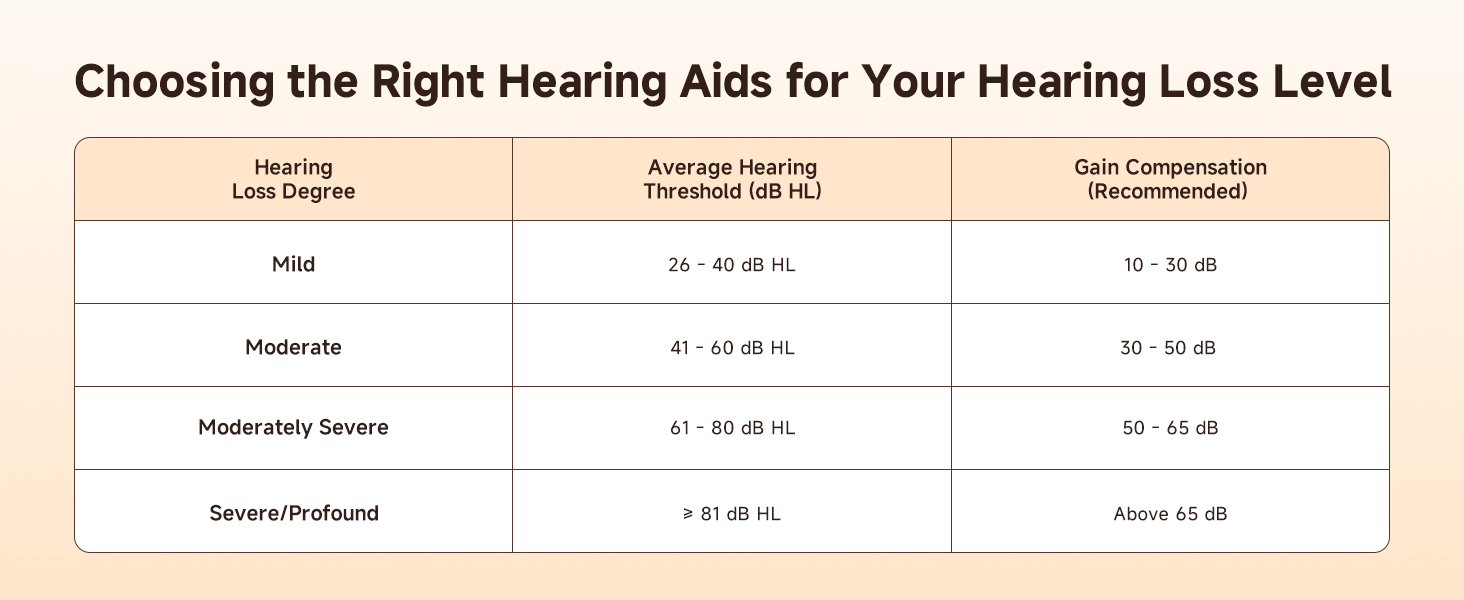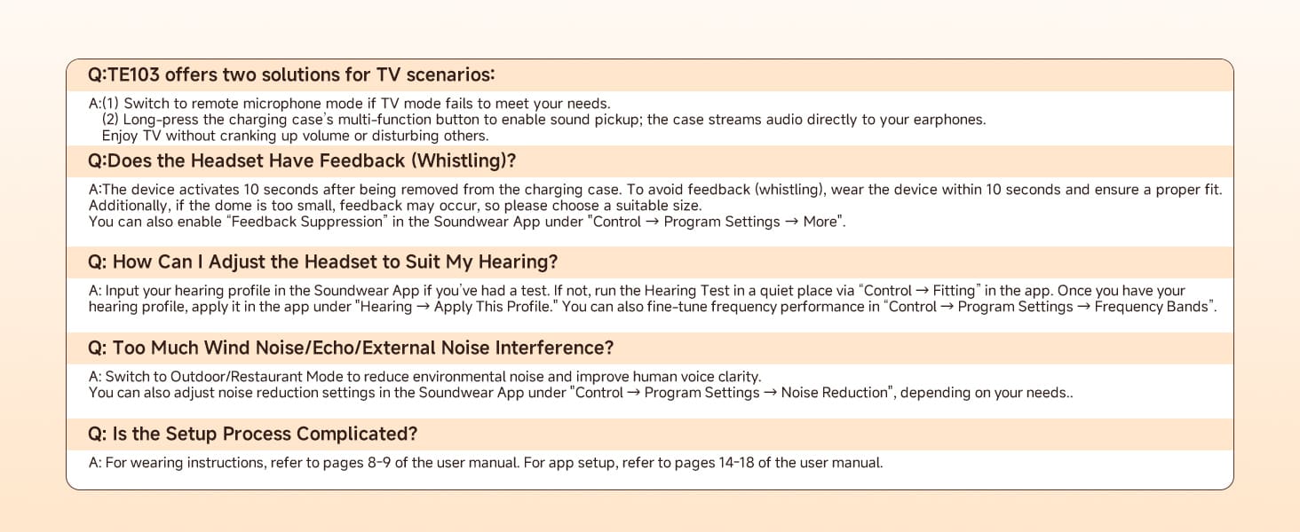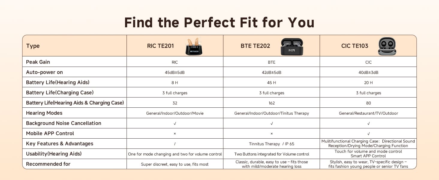 The TE103 smart hearing aid has a gain of 40dB+3dB, suitable for people with mild to moderate hearing loss. The charging case supports directional sound pickup, allowing you to place it near a TV, radio, or the speaker. The hearing aid supports 6 levels of volume adjustment, allowing you to selectively amplify the sound you need.