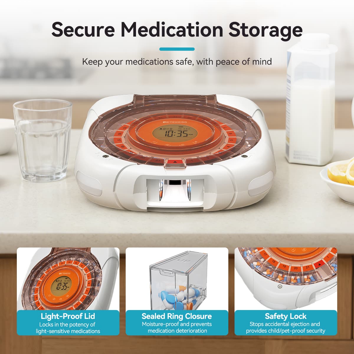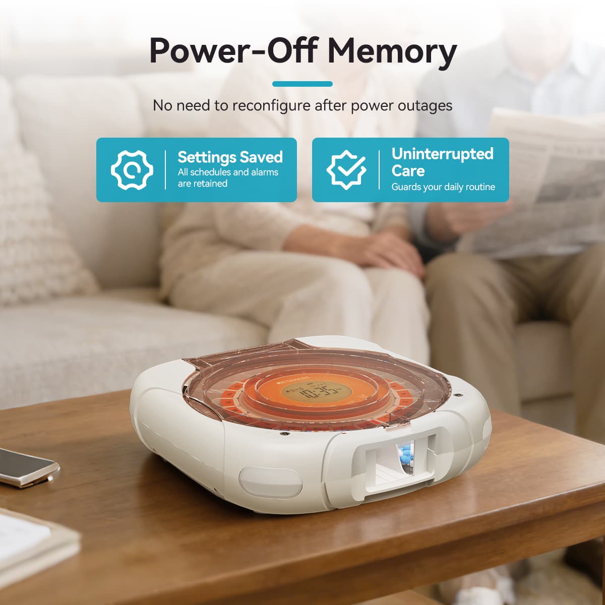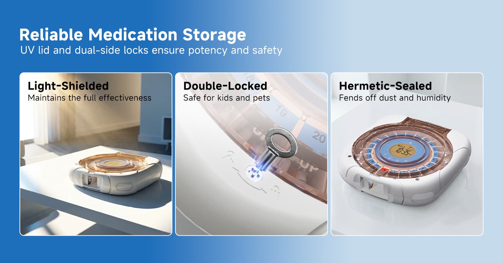 Featuring a mechanical structure lock, the pill compartments are fully secured when not in use, eliminating the risk of accidental access or medication mix-ups entirely. No tilting is needed to retrieve pills— the corresponding compartment pops out automatically, making operation effortless, especially for users with limited hand dexterity.