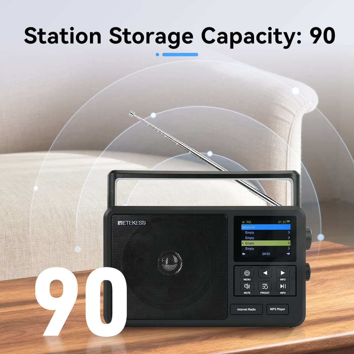 The radio station storage capacity can pre-store 90 (30 for each of the network radio mode, FM mode, and DAB mode).