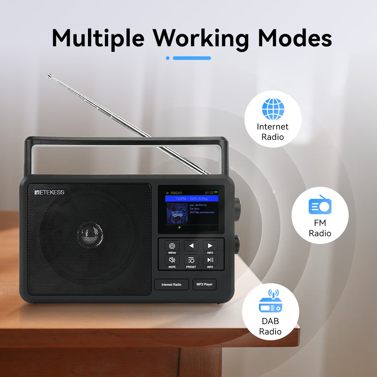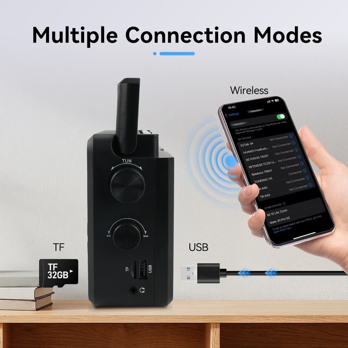 In the radio mode; it supports fully automatic search and storage of radio stations, and large rotary pulley for tuning.
