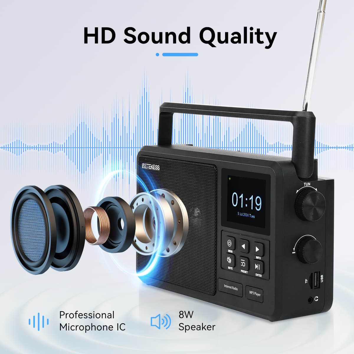 It adopts a large-caliber 4-inch, 4Ω, 8W speaker, and supports listening with headphones, which is suitable for the needs of the majority of users.