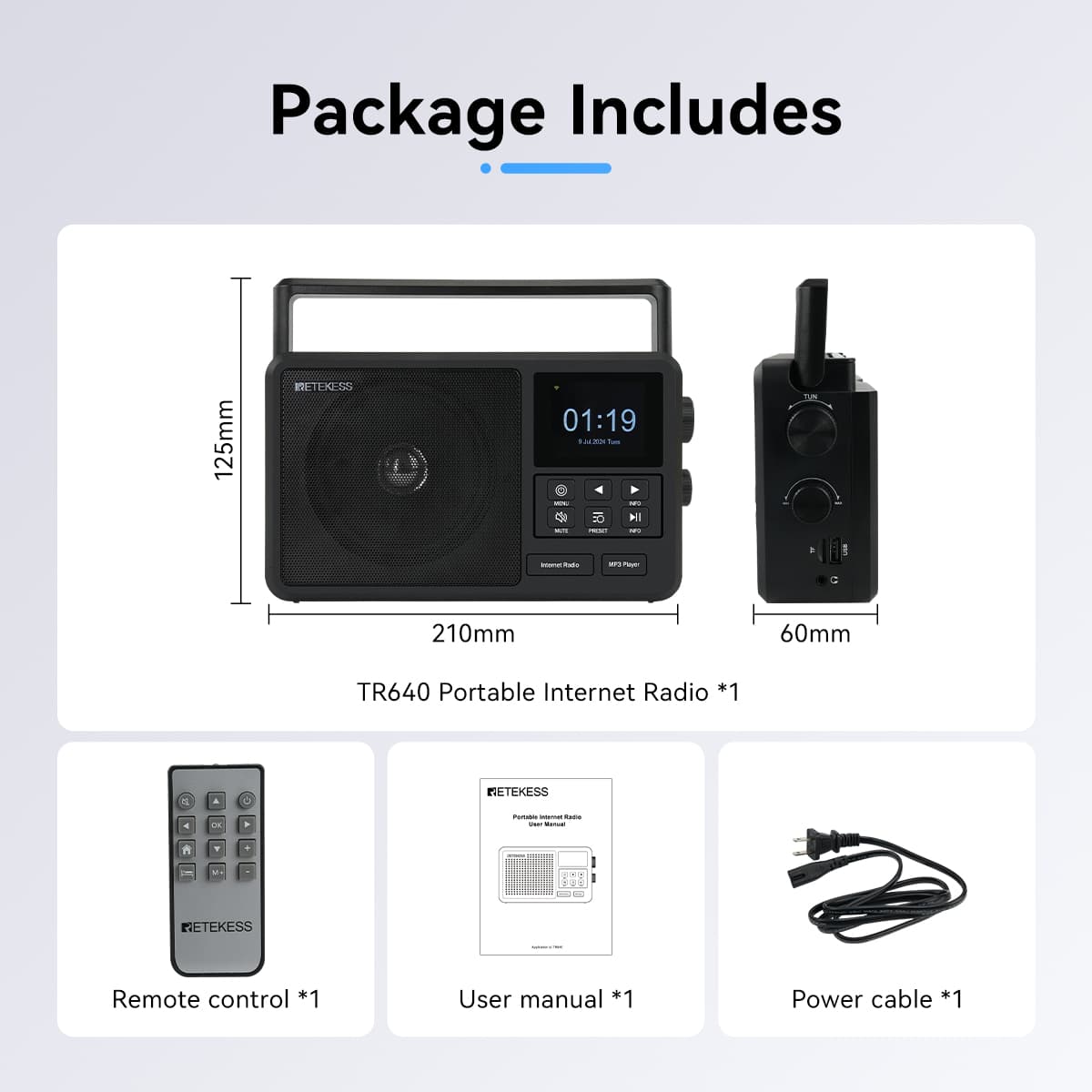The remote control supports common operations such as volume adjustment, muting, station selection, and sleep setting, which solves the pain point that users cannot control the machine from a long distance.