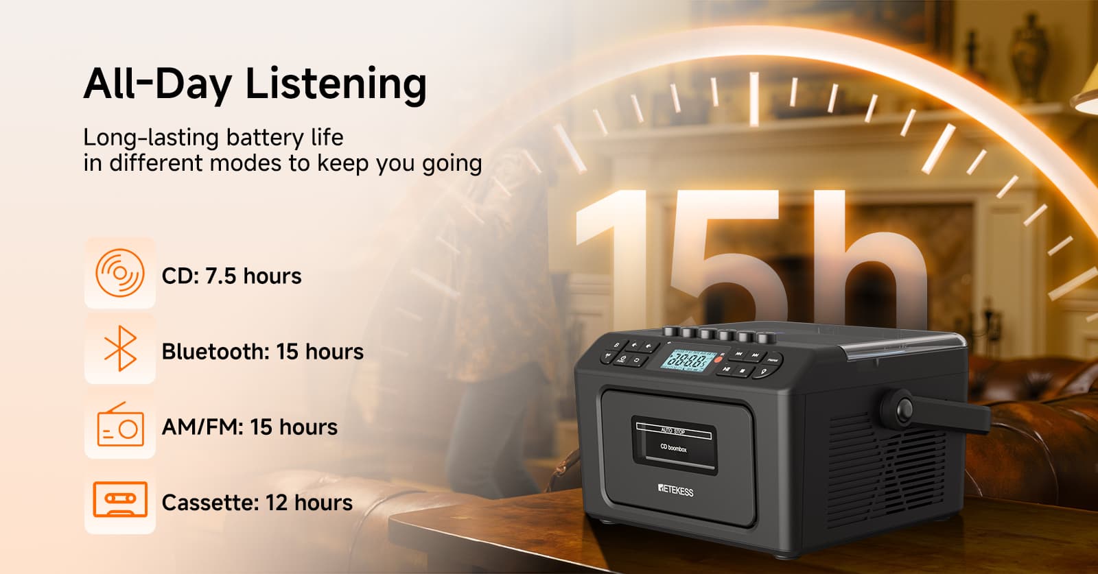 The LCD display clearly shows mode, track number, time, battery level, and other information at a glance. A headphone jack is provided; the speaker automatically mutes when headphones are inserted, allowing you to enjoy private listening. In case of display errors or unresponsive operations, press the RESET button on the back to quickly restore normal functionality for smoother use.