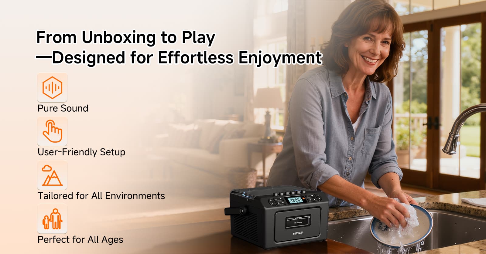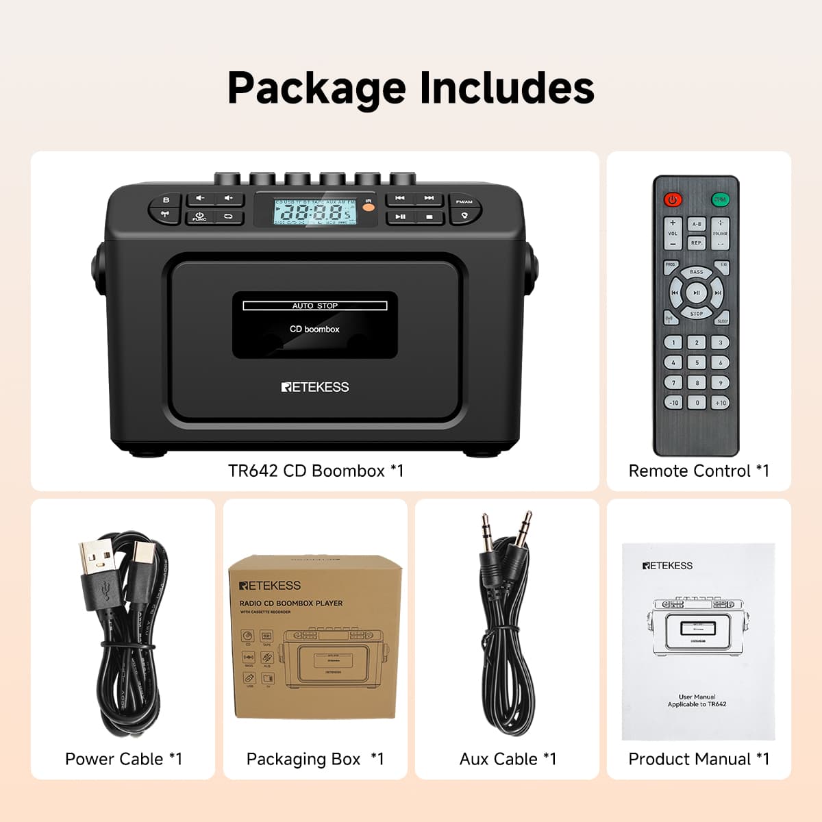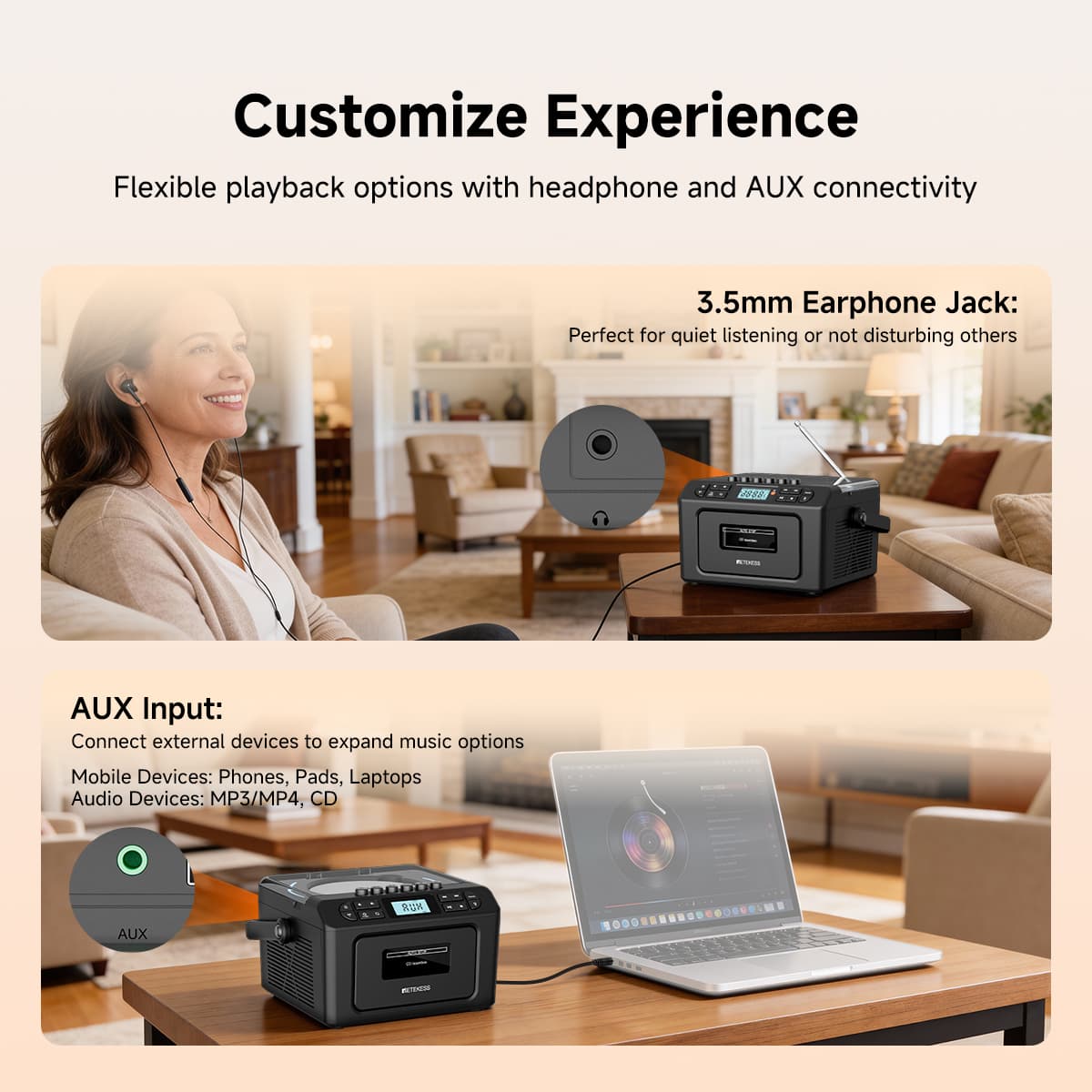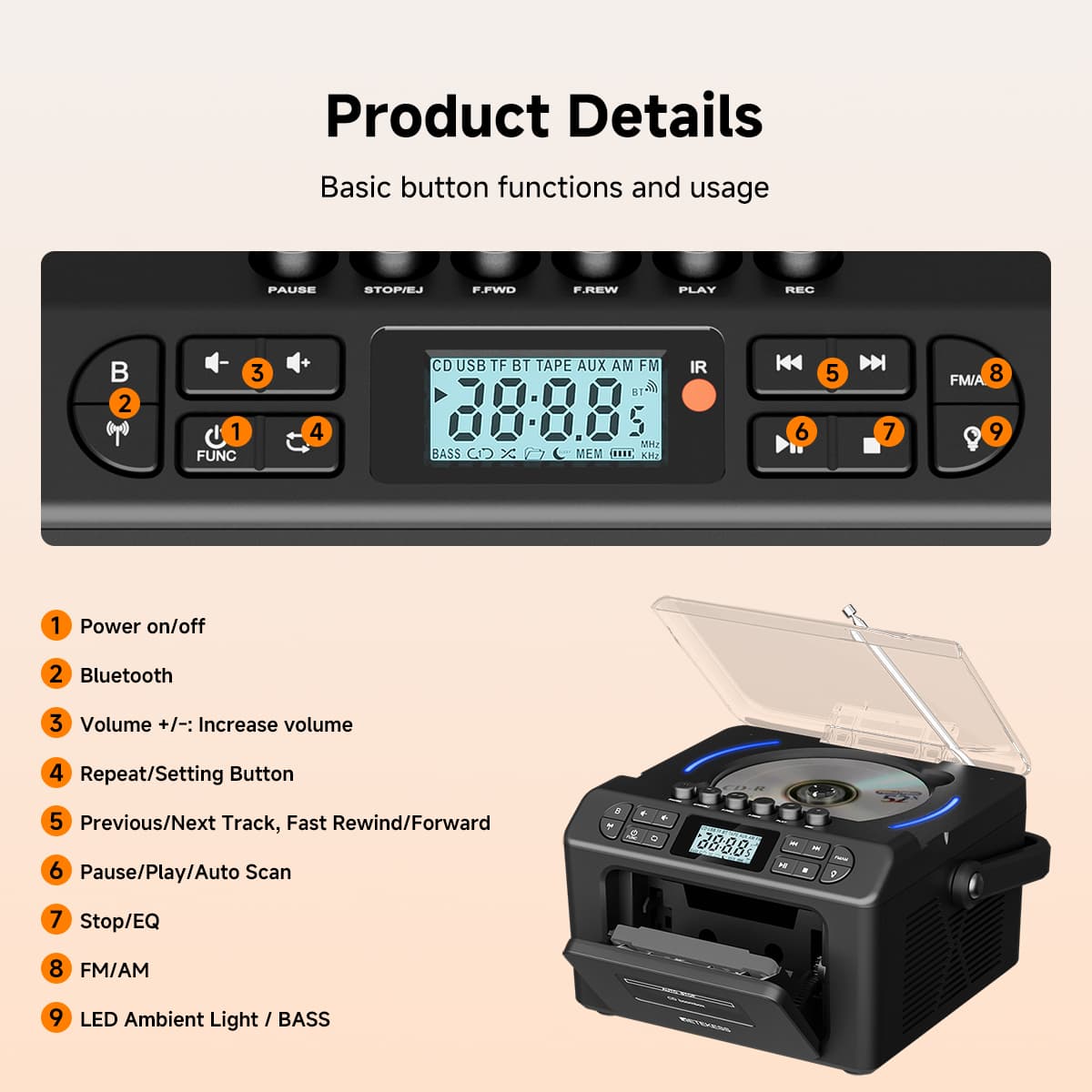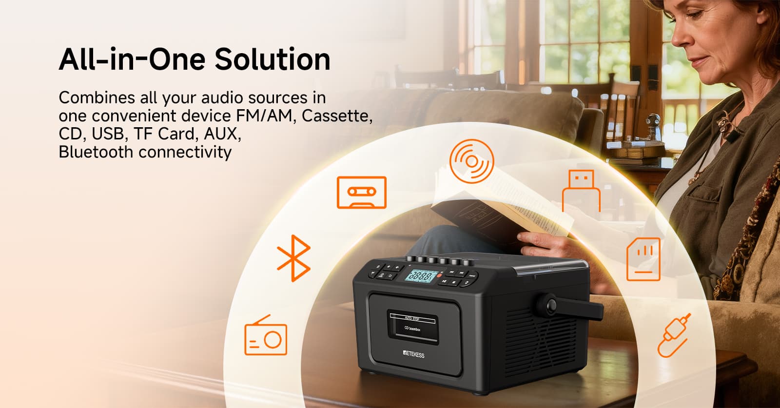Supports seven playback modes - tape, CD, USB flash drive, TF card, Bluetooth, AUX, and FM/AM. Whether it's your cherished vintage music tapes, classic CD discs, or MP3 files in modern digital devices, it can play them effortlessly. The tape function also allows recording from multiple audio sources such as CD, radio, and Bluetooth. The anti-erasure design protects precious audio memories, meeting the audio needs of different eras in one stop.