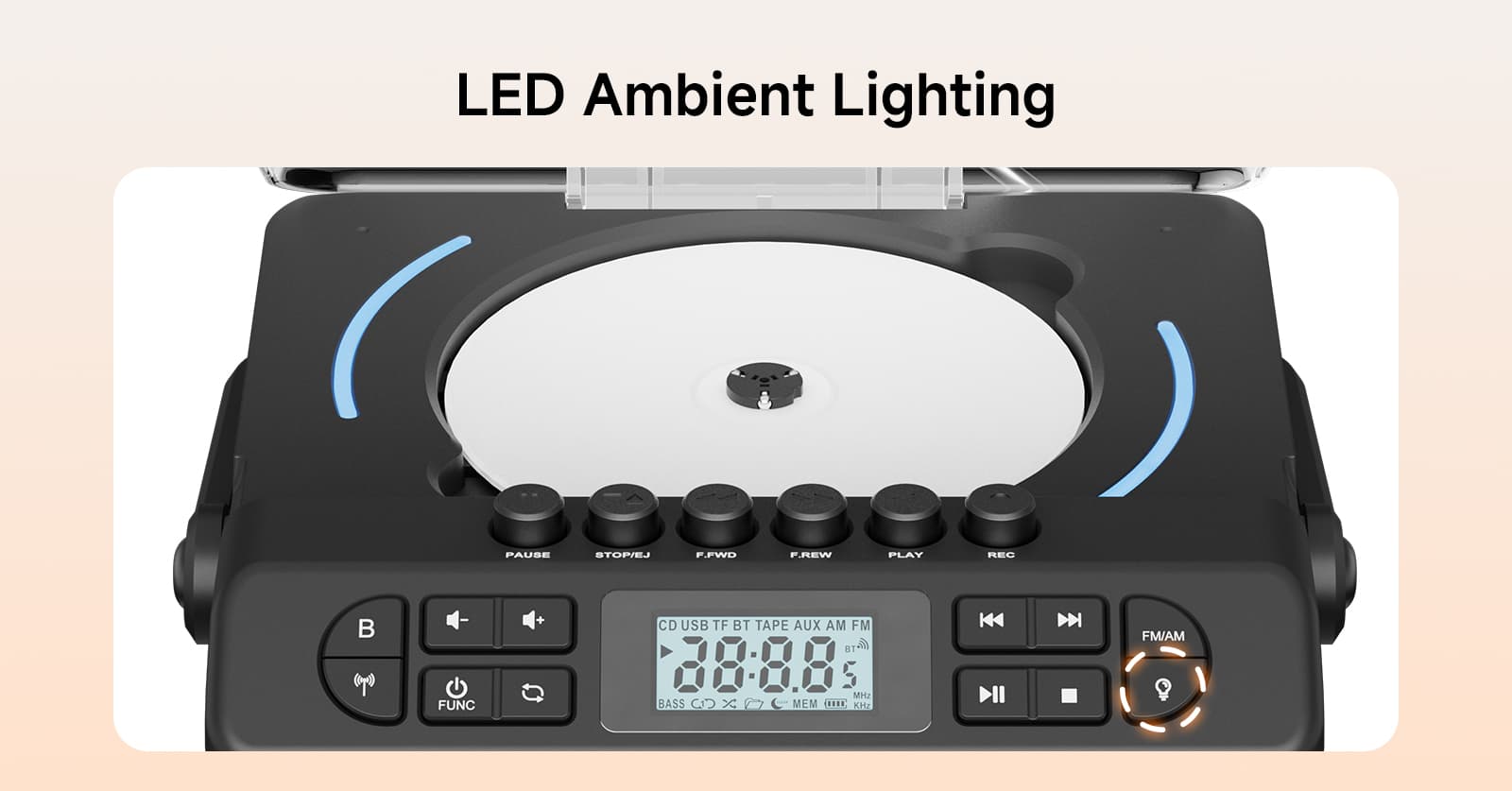 Press the STOP/EJ button to open the tape compartment, insert a tape, switch to TAPE mode, and start playing. It supports fast forward (F.FWD), fast reverse (F.REW), and pause (PAUSE) functions. The tape automatically stops when it reaches the end, perfectly replicating the operating feel of vintage tape players and evoking youthful memories.