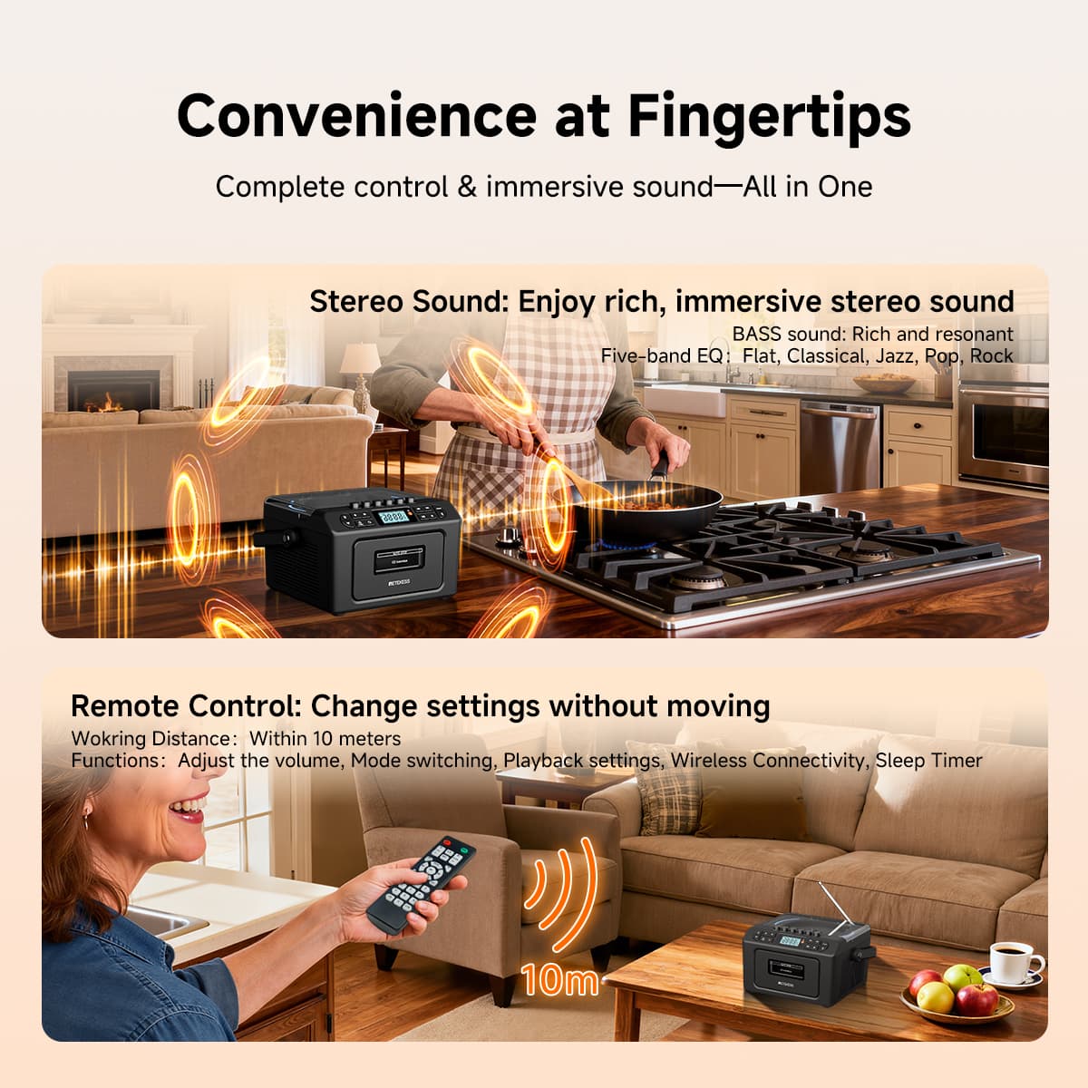 Compatible with standard CDs and MP3 discs. It automatically plays after reading the disc and supports single-track repeat, full-disc repeat, and shuffle playback modes. Programmable playback is available (up to 20 tracks for CDs and 99 tracks for MP3s), allowing you to customize your exclusive track order. It caters to the detailed needs of music enthusiasts.