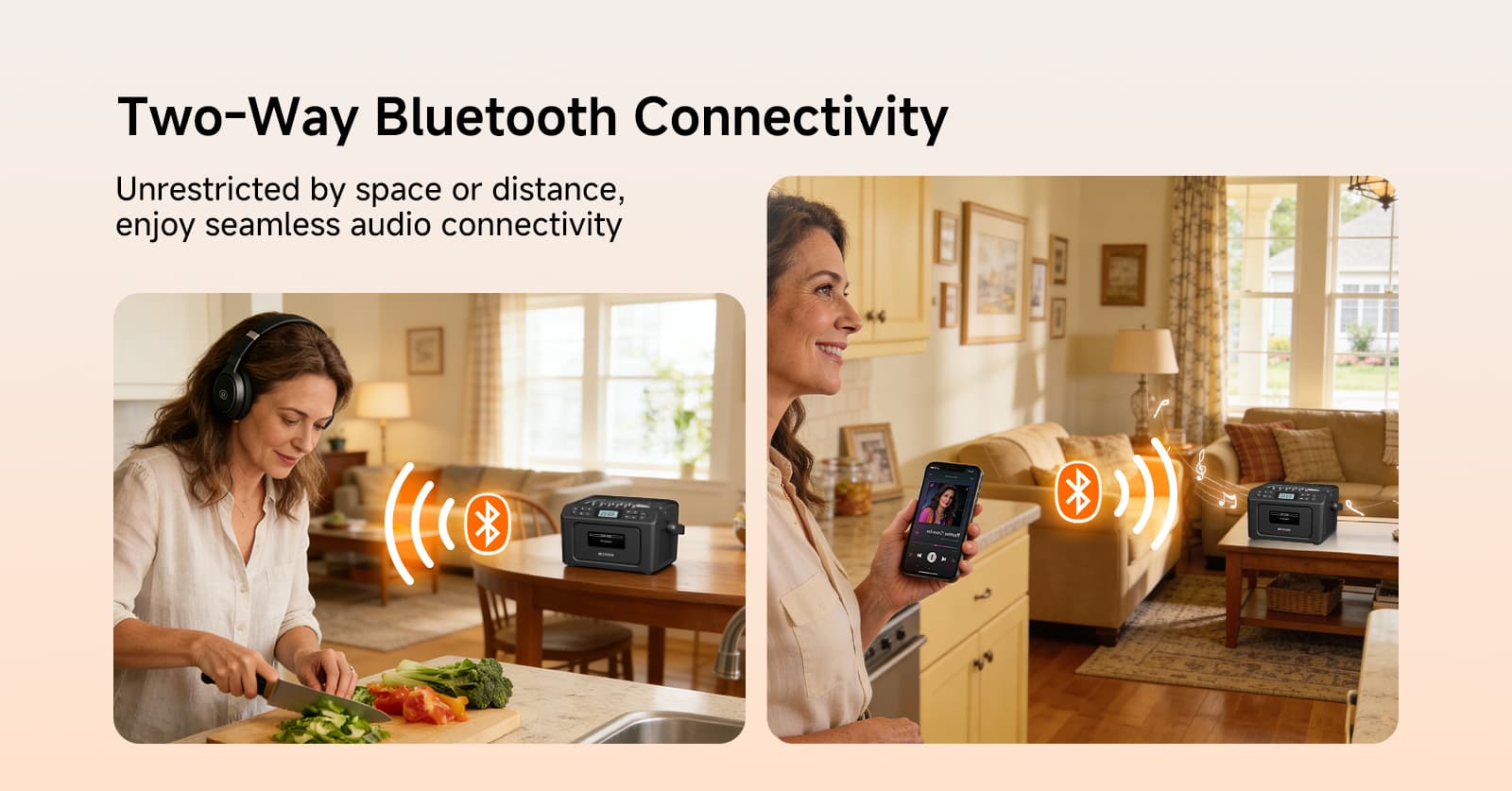 Bluetooth receiving mode enables quick pairing with "RETEKESS-TR642" and supports automatic reconnection to the last connected device, providing wire-free listening freedom. Bluetooth transmission mode (activated by short-pressing the BT LAUNCH button) can connect to other Bluetooth receiving devices for easy music sharing. Reconnect by reactivating the mode after disconnection.