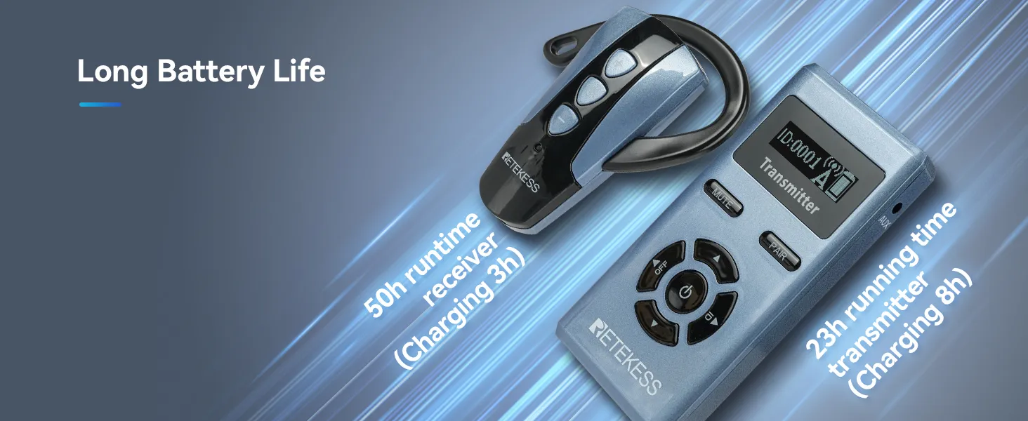 The battery is durable, with the receiver offering up to 50 hours of battery life, eliminating the need for frequent charging.