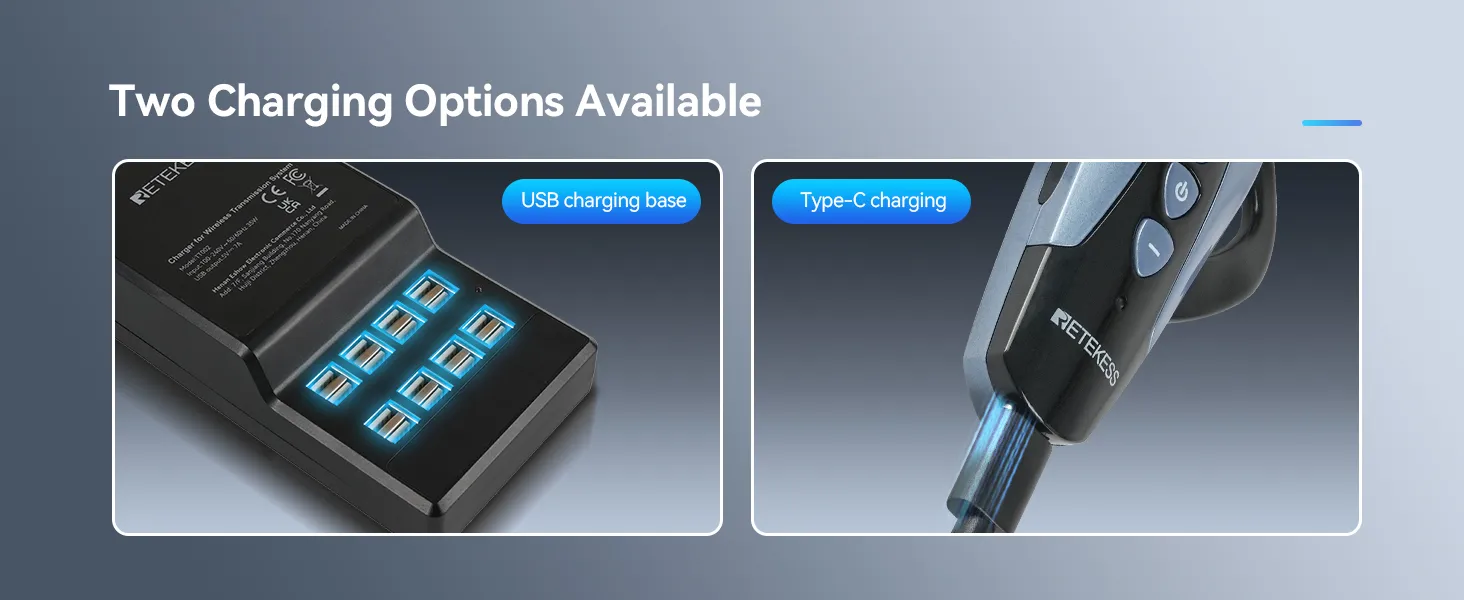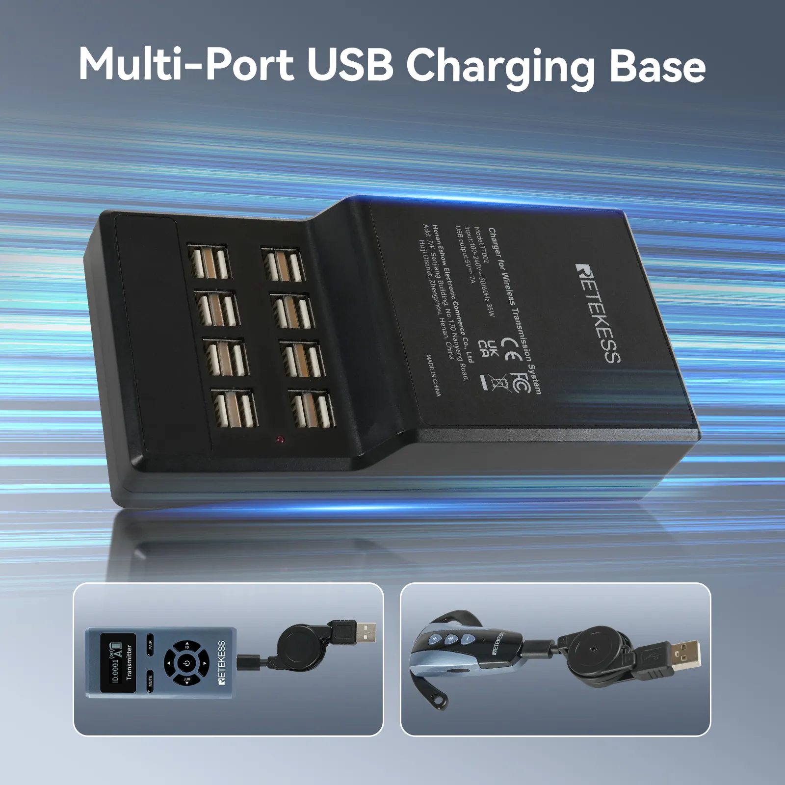 16-Slot Charging Base: 16-port USB charging base can charge 16 receivers or transmitters simultaneously. Adapter input: AC100-240V.