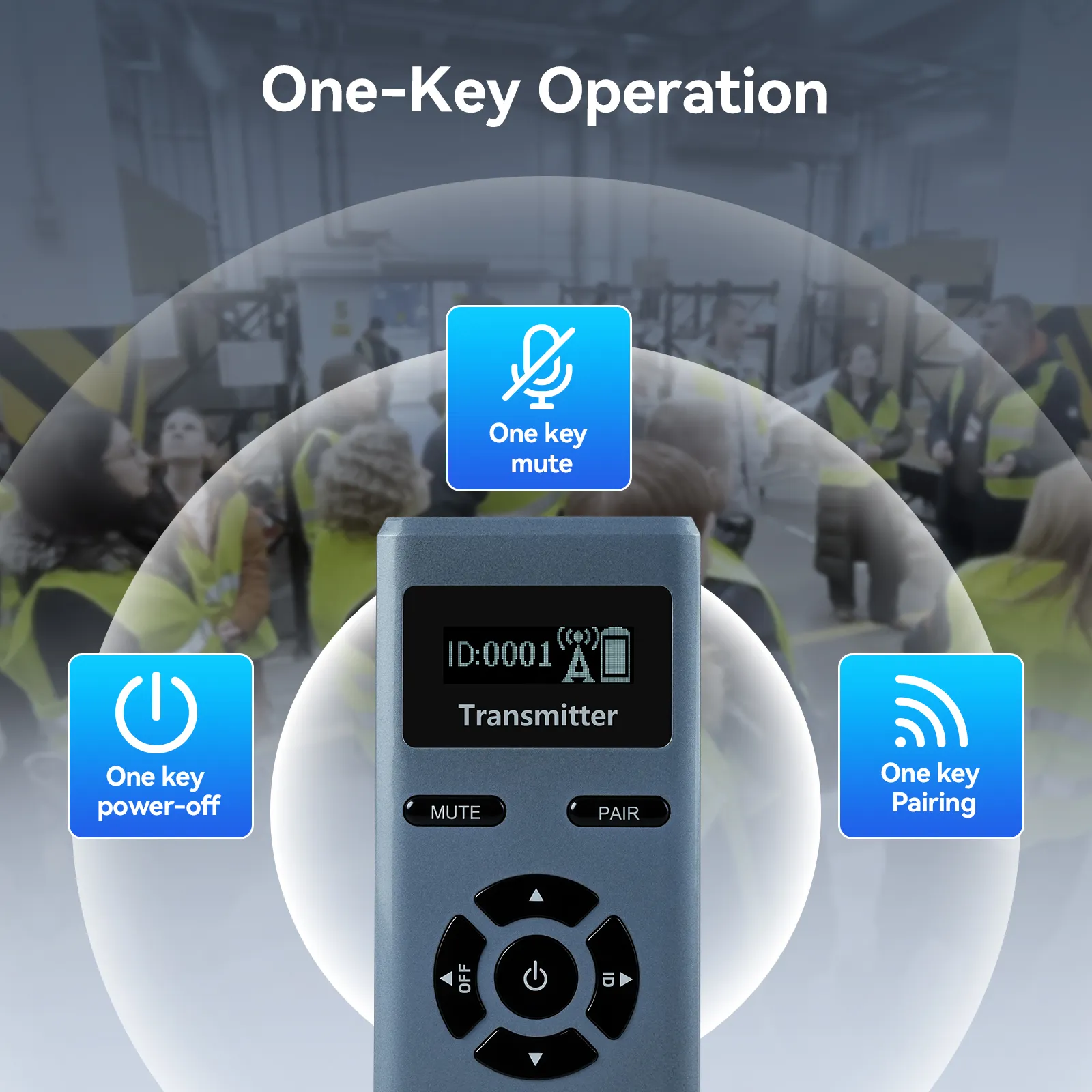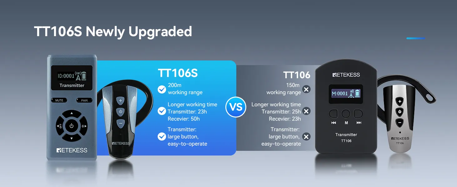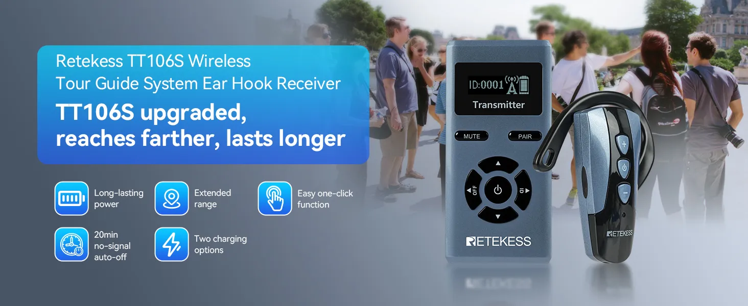 The TT106S wireless headphone tour guide system is an upgraded version of the highly acclaimed TT106. It offers stable signal and clear sound quality. Factory hosts use the transmitter to give explanations, while visitors listen by wearing the wireless receiver.