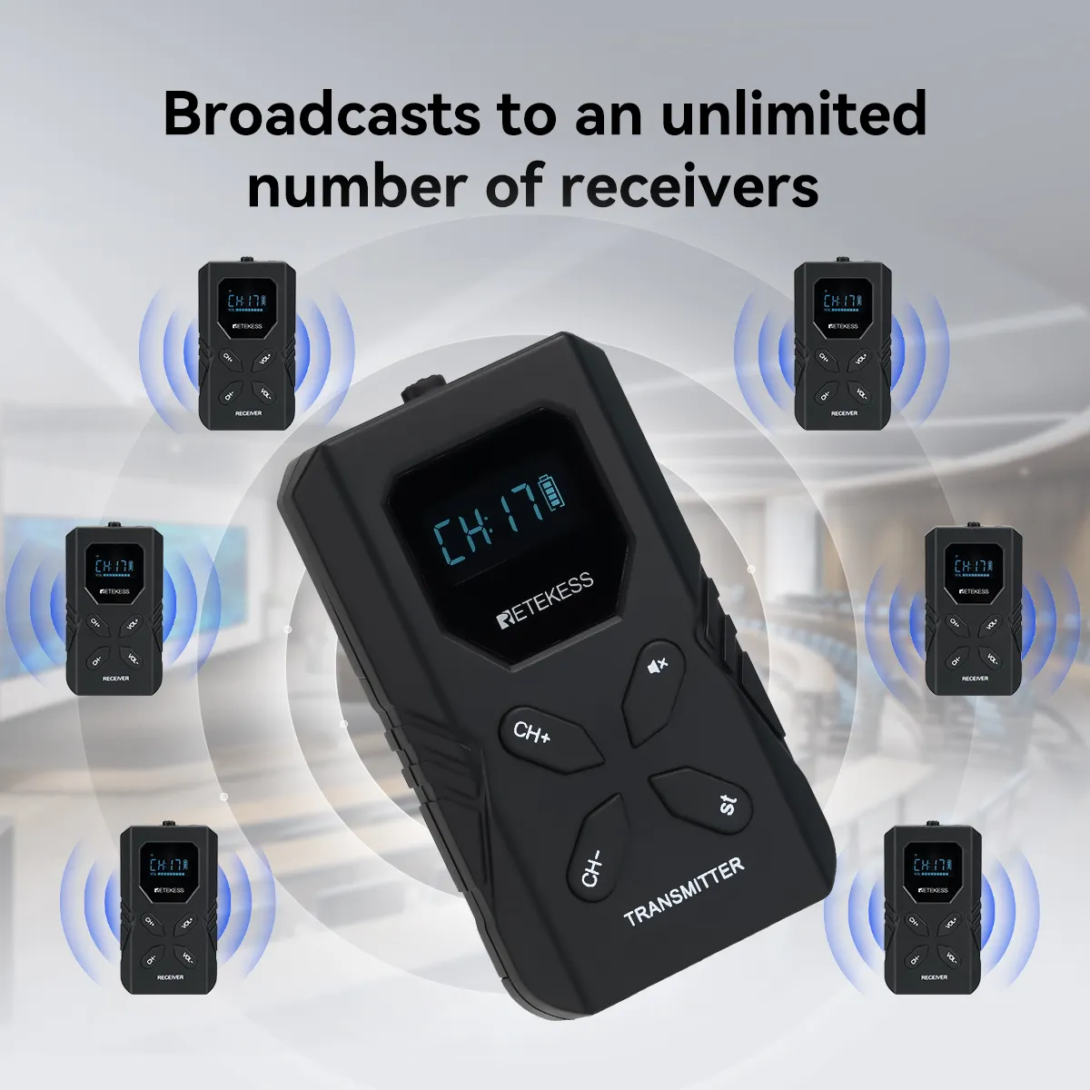 Retekess TT117 TT118 Portable Wireless Simultaneous Interpretation System provides superior sound quality and full mobility,combining multiple-channel transmitter and receivers, as well as improved reliability and versatility.It can be expanded by adding an unlimited number of additional receivers.More foreign languages/ auditory sources can be added for a maximum of 6 in the same area by purchasing 1 additional transmitter and microphone per auditory source.Best Price Guaranteed and Extended warranty for long-term reliability and support.