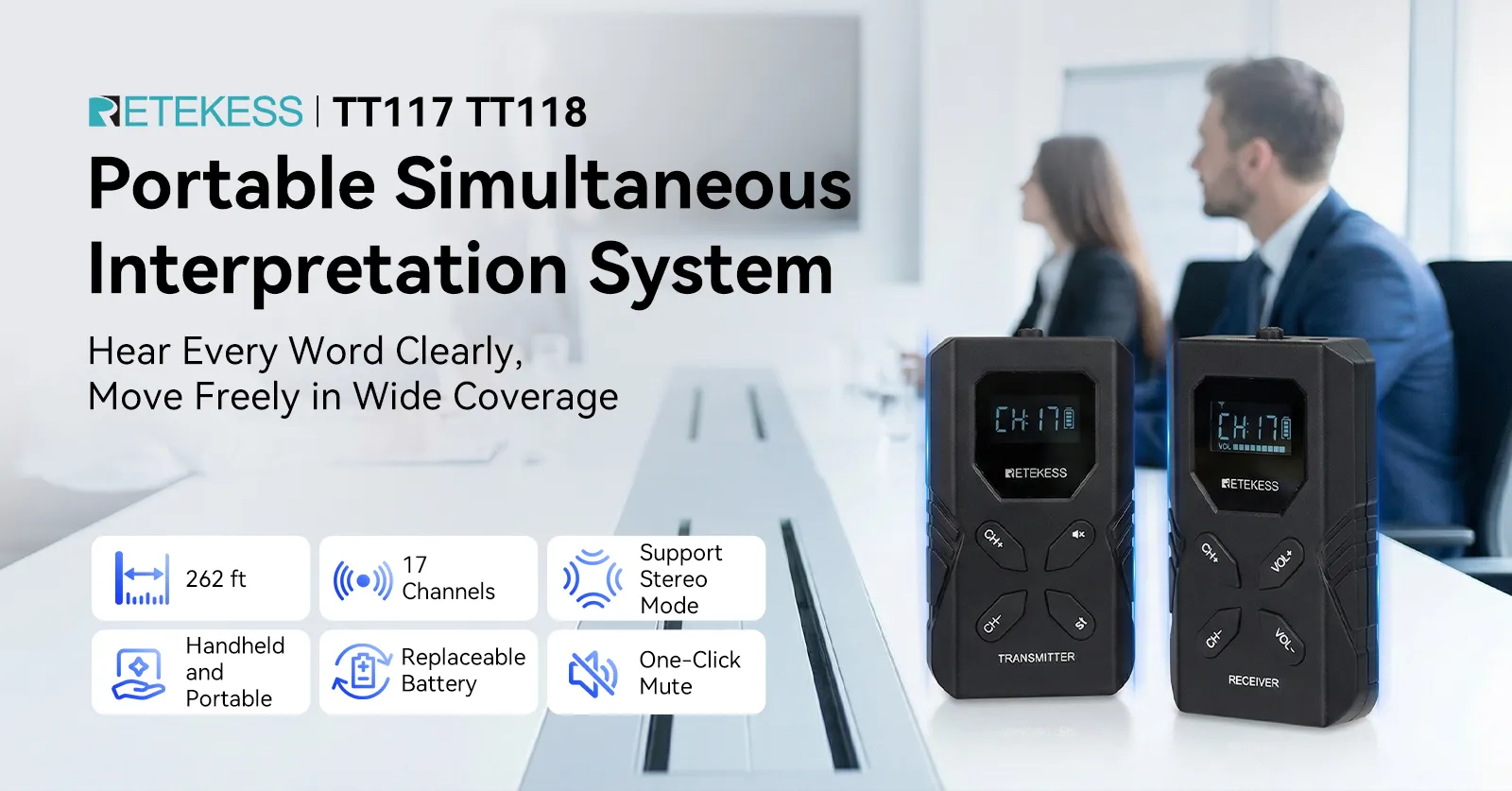 The Retekess TT117 TT118 Simultaneous Interpretation System provides exceptional sound quality and full mobility.The system includes multi-channel transmitter and multiple receivers,lavalier microphone, and noise-canceling headphones.It can be configured to support up to 6 different languages or audio sources within the same area; each additional source requires just one extra transmitter and microphone.