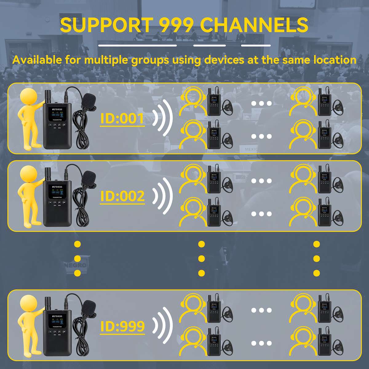 Whisper tour guide equipment has 999 channels to choose from, supporting multiple groups at the same location at the same time, with each group using a different channel without interference or crosstalk between them.