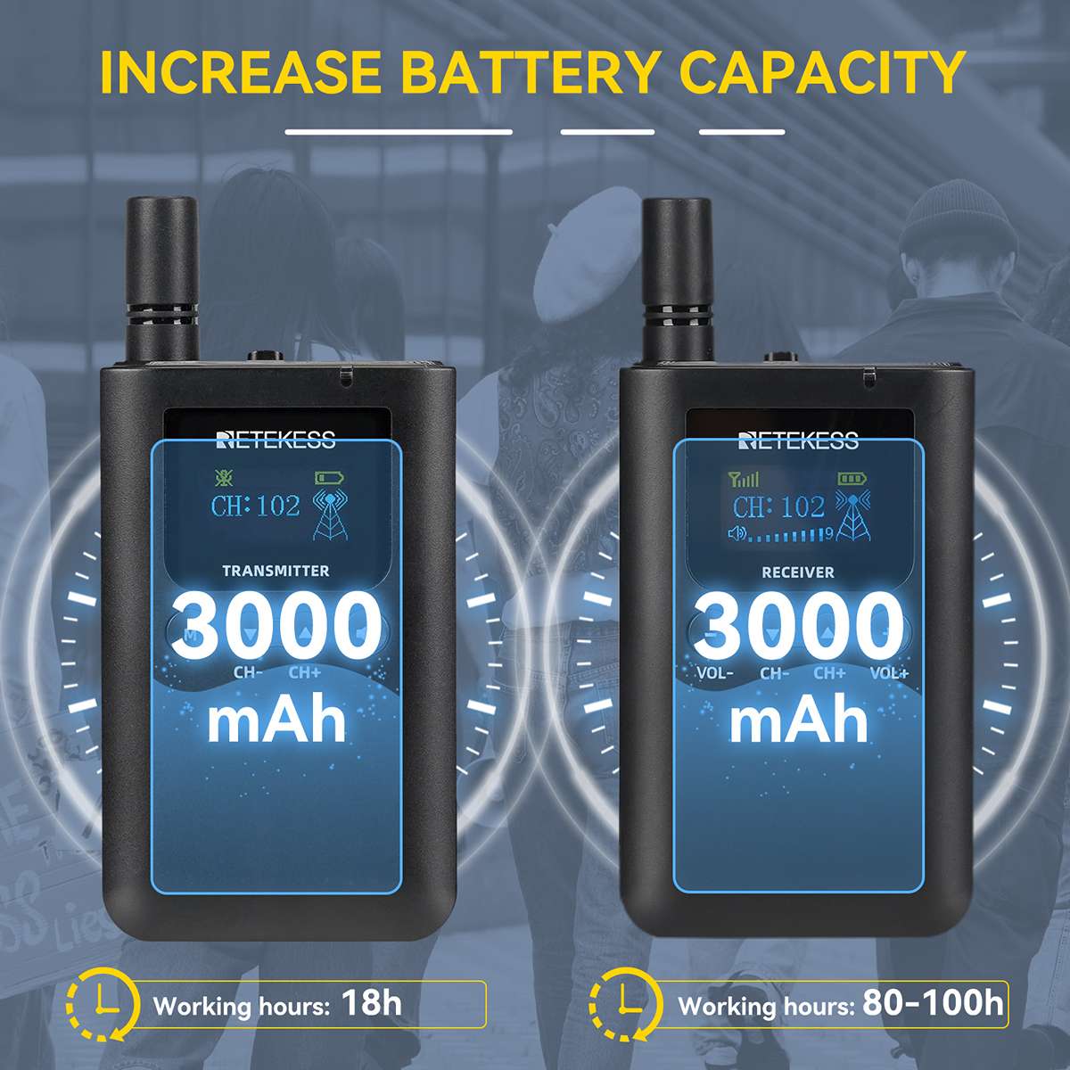 Both the receiver and transmitter are equipped with 3000mAh batteries. The transmitter works for 18 hours, receiver use time is about 80-100 hours, eliminating the trouble of frequent charging.