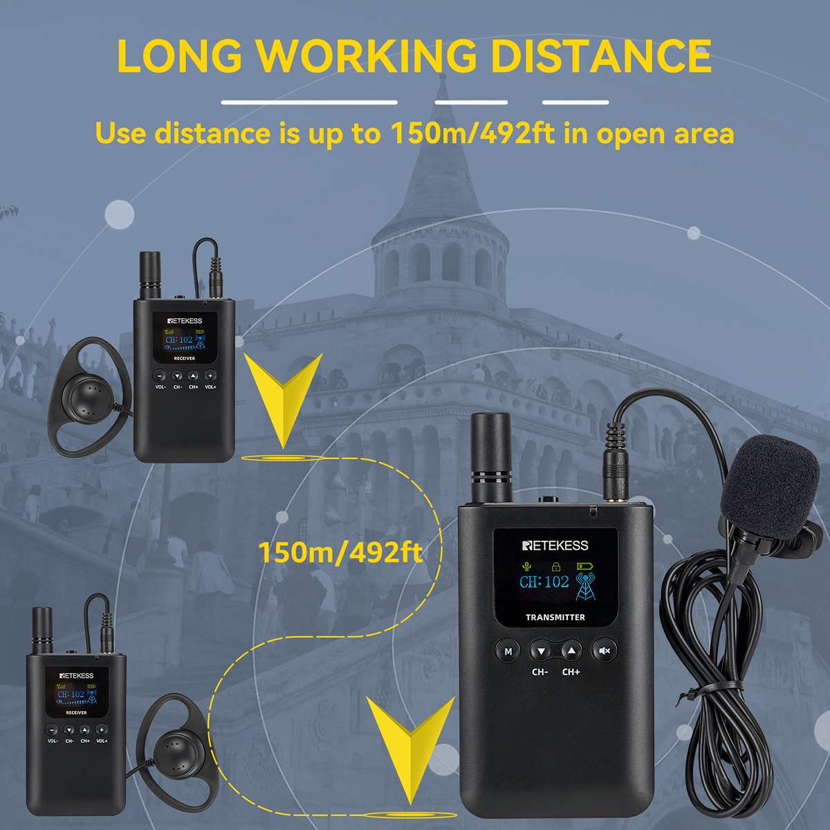 The whisper system for tours has an operating range of up to 150m/492ft in open areas, so receivers don't have to congregate around the transmitter to miss any information.