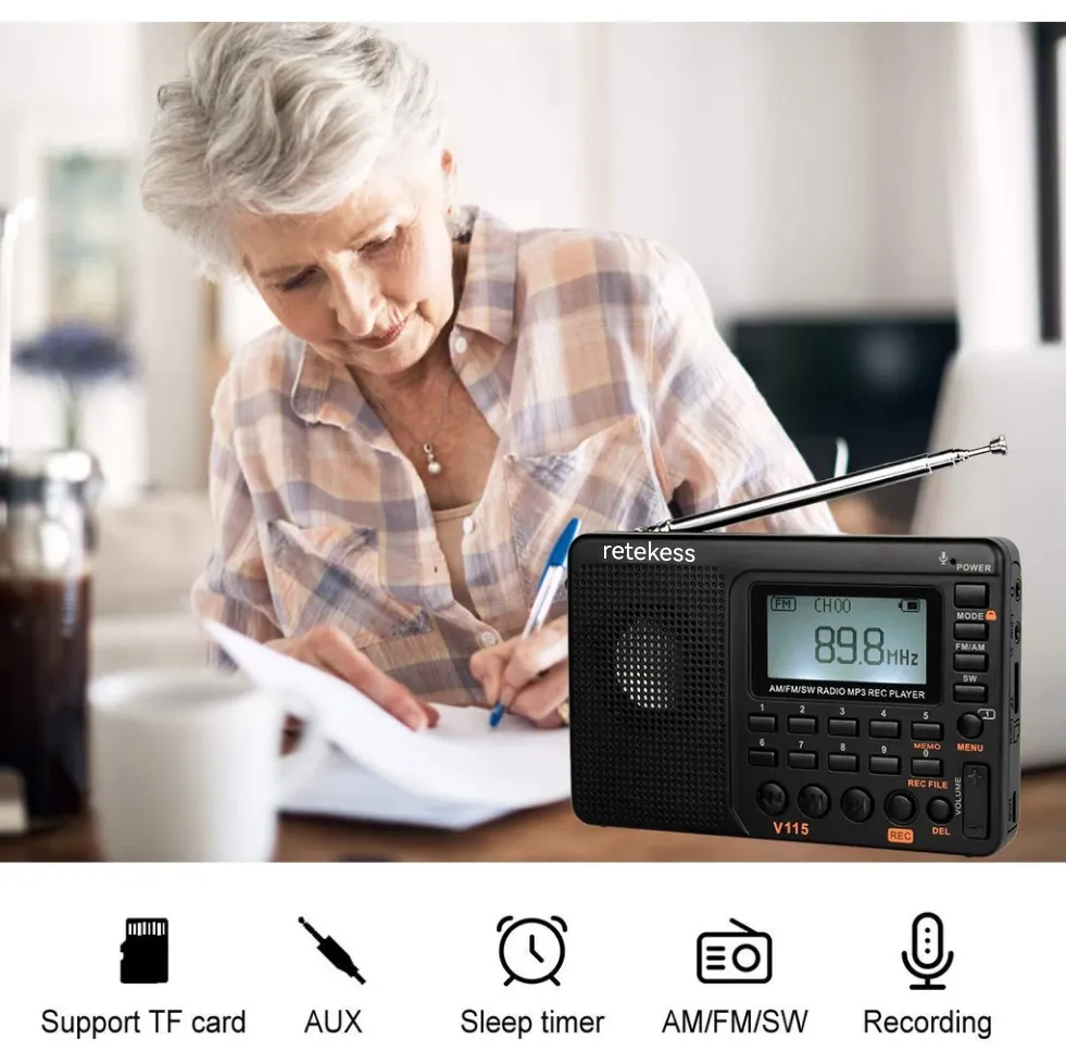 V115 AM FM radio with LCD display screen has many displays, such as the changes in electric quantity, the AM FM frequency, the sleep timer. 5 seconds