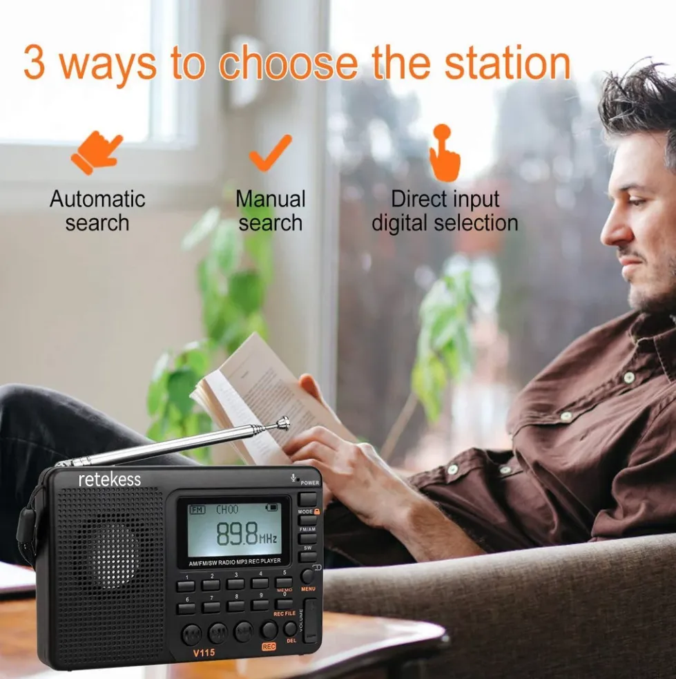 portable radio with the bass diaphragm and you can search the radio station by Automatic and Manual, also can direct input radio frequency to search